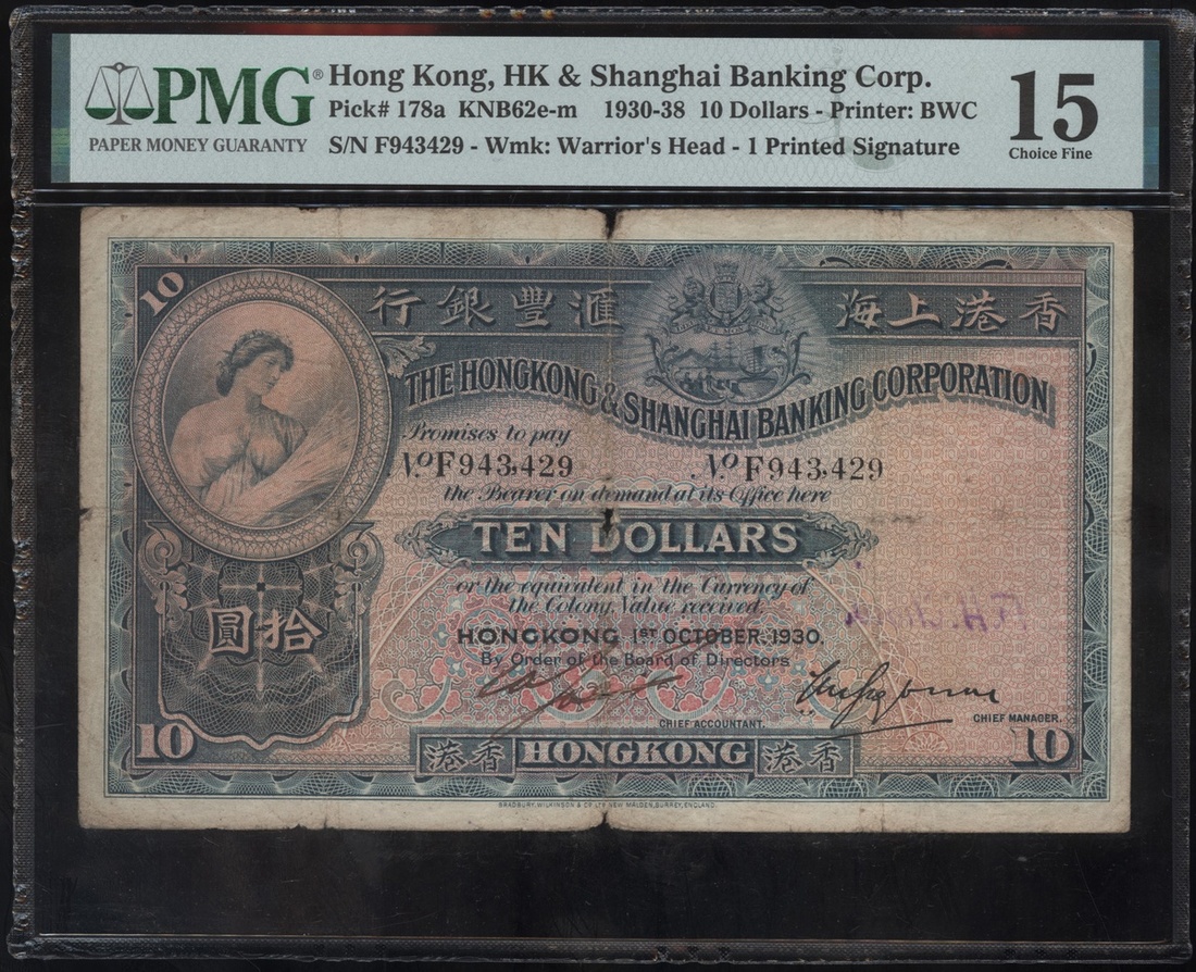 The Hongkong and Shanghai Banking Corporation, $10, 1.10.1930, serial number F943429, (Pick 178a), PMG 15 Choice Fine (Annotation)