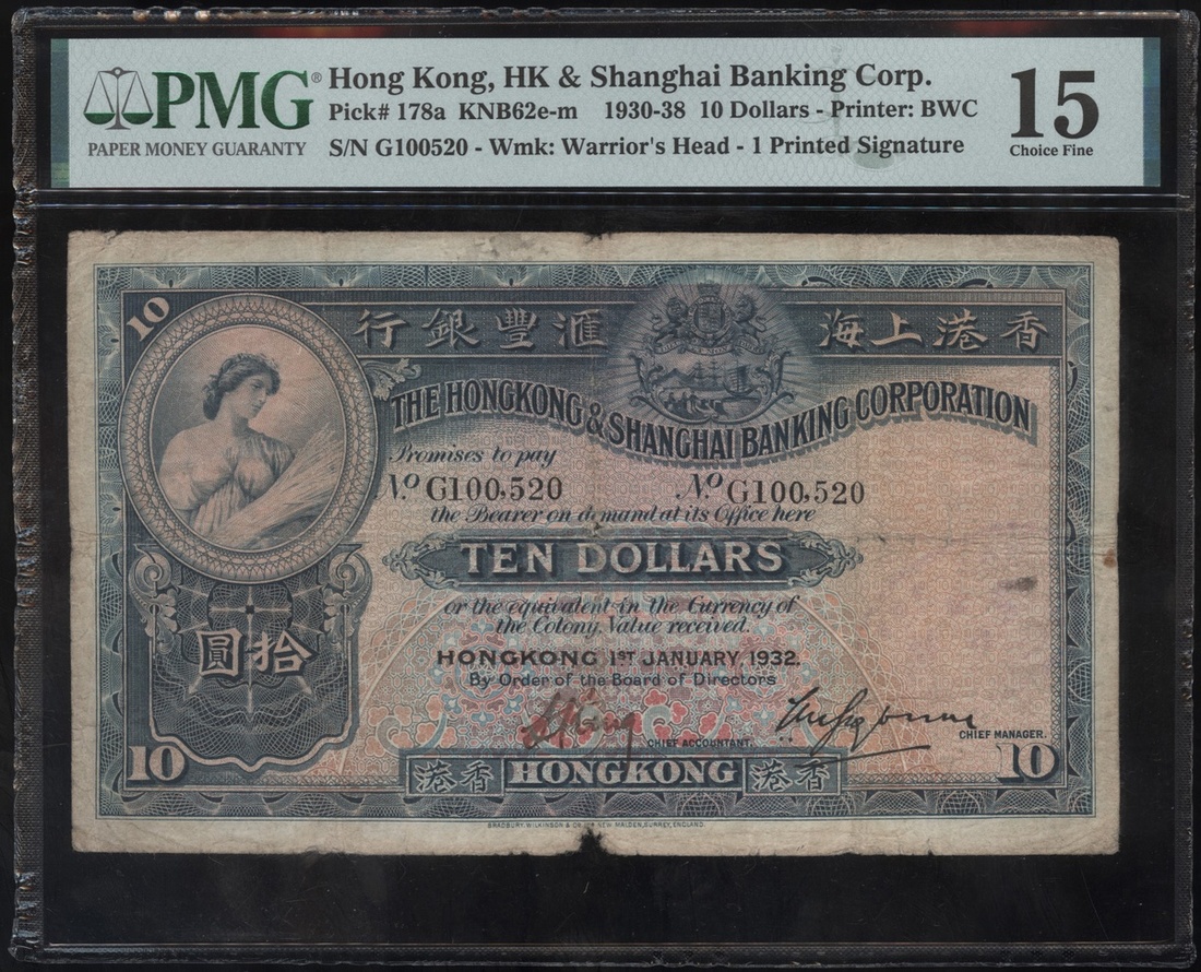 The Hongkong and Shanghai Banking Corporation, $10, 1.1.1932, serial number G100520, (Pick 178a), PMG 15 Choice Fine (Ink Stamp). A scarcer date