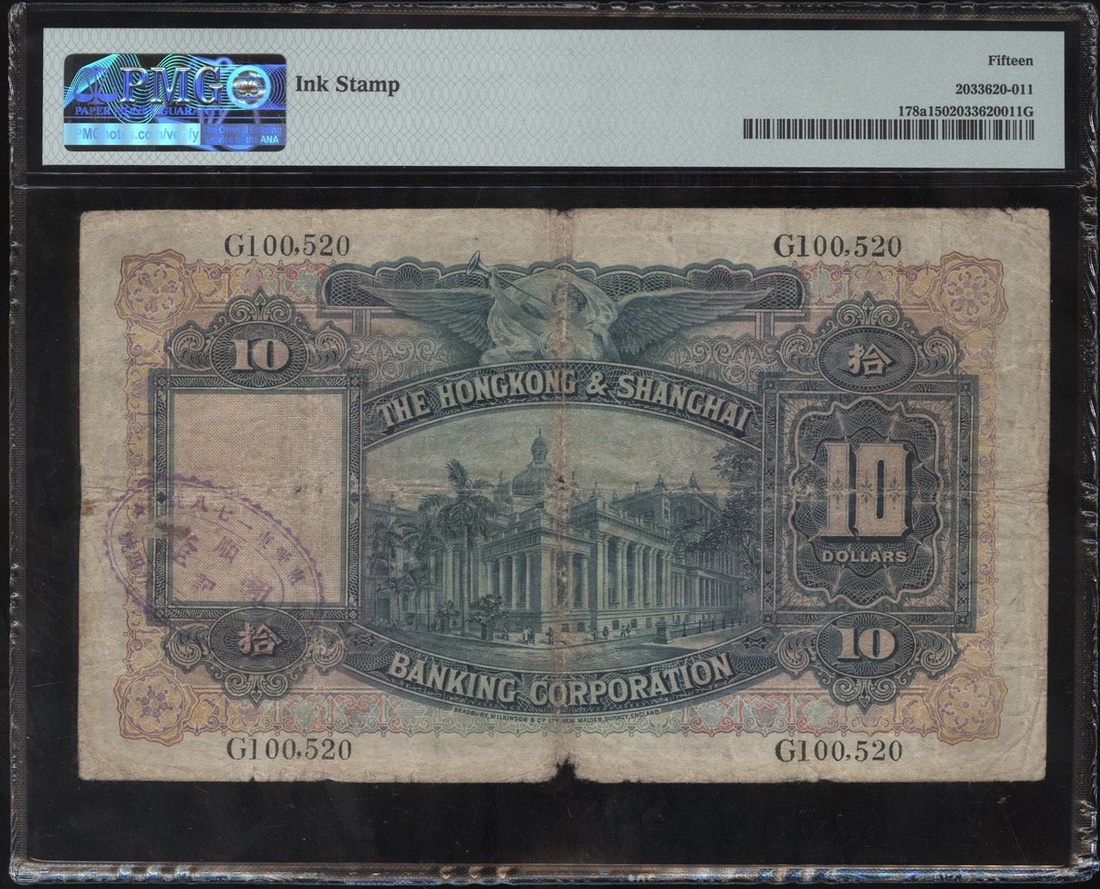 1932年香港上海匯豐銀行10元,編號G100520,PMG 15,有墨印,較稀有年份