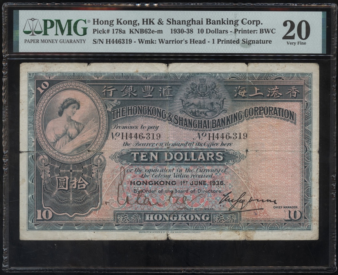 The Hongkong and Shanghai Banking Corporation, $10, 1.6.1936, serial number H446319, (Pick 178a), PMG 20 Very Fine (Splits)