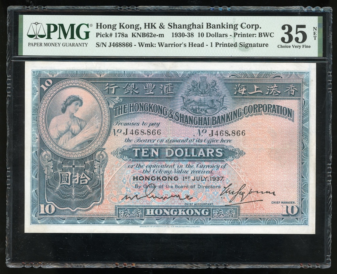 The Hongkong and Shanghai Banking Corporation, $10, 1.7.1937, serial number J468866, (Pick 178a), PMG 35NET Choice Very Fine (Repaired).