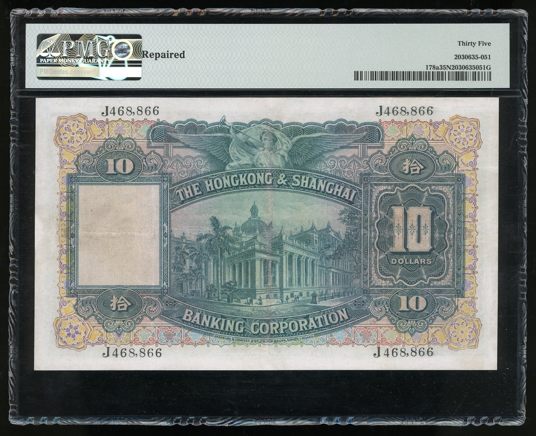 1937年香港上海匯豐銀行10元,編號J468866,PMG 35NET,有修補