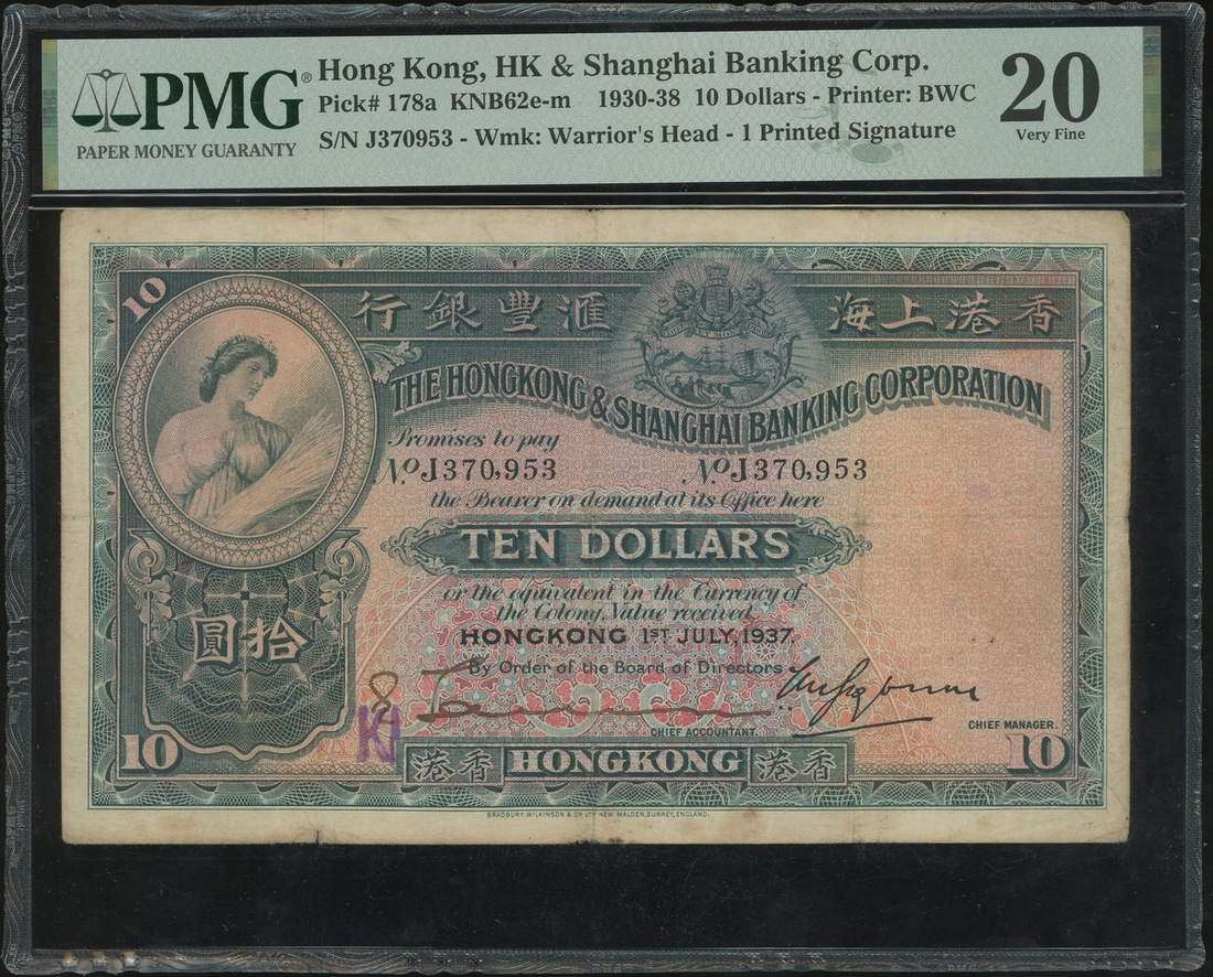 The Hongkong and Shanghai Banking Corporation, $10, 1.7.1937, serial number J370953, handsigned at lower left,