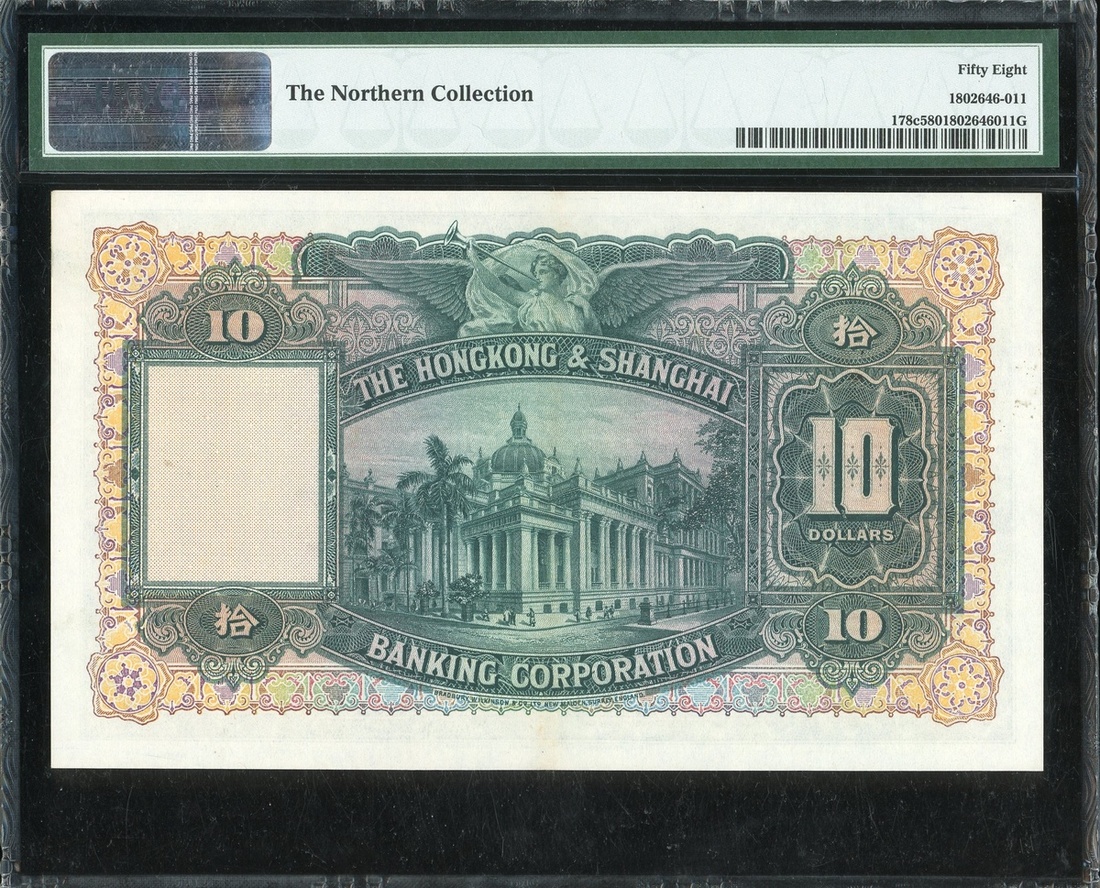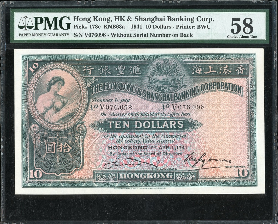 The Hongkong Shanghai Banking Corporation, $10, 1.4.1941, serial number V076098, (Pick 178c), PMG 58 Choice About Uncirculated