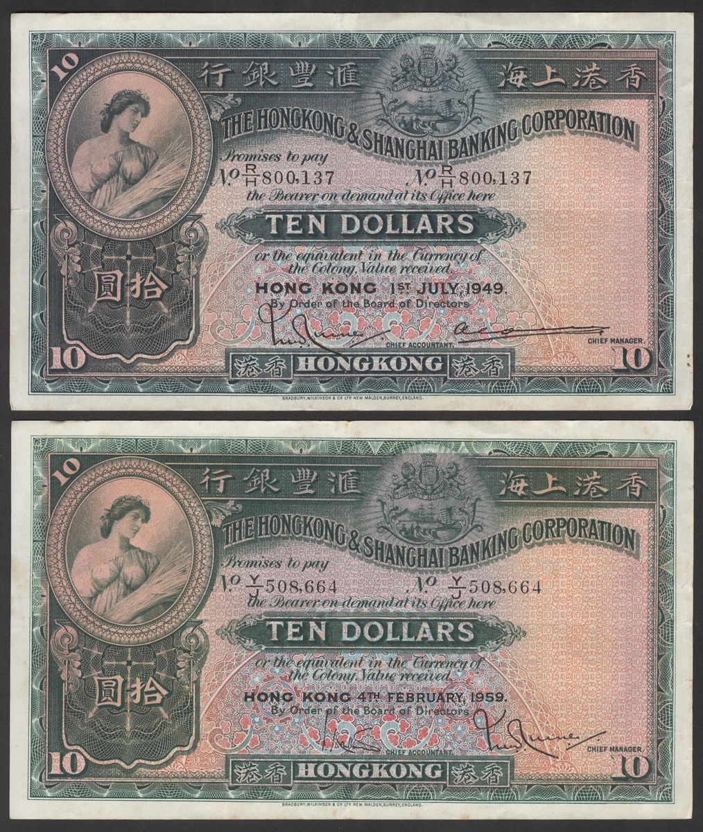 The Hongkong & Shanghai Banking Corporation, a pair of 10 Dollars, 1.7.1949 and 4.2.1959, serial numbers R/H800137 and Y/J508664, green and multicoloured, Ceres at top left, reverse bank building, (Pick 179Aa, 179Ae), generally good very fine, viewing highly recommended, sold as is, no returns (2)