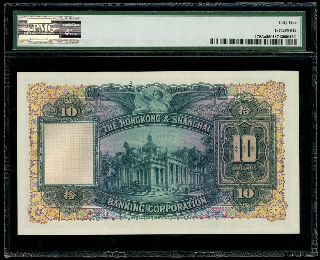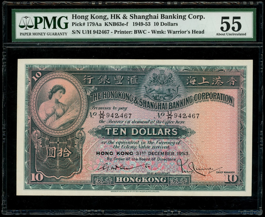 The Hongkong and Shanghai Banking Corporation, $10, 31.12.1953, serial number U/H 942467, (Pick 179Aa), PMG 55 About Uncirculated