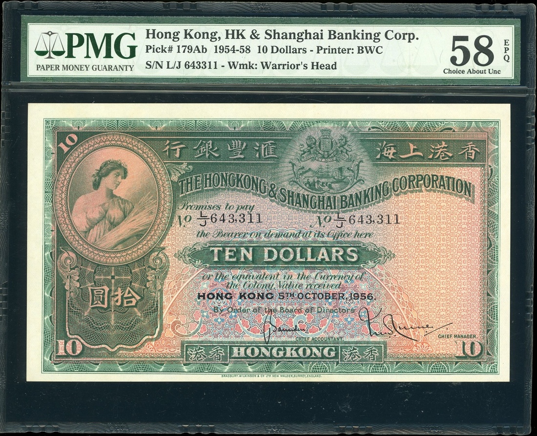 1956年香港上海匯豐銀行10元,編號L/J 643311,PMG58EPQ