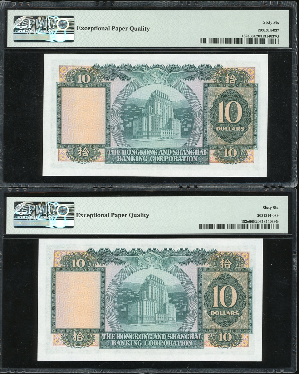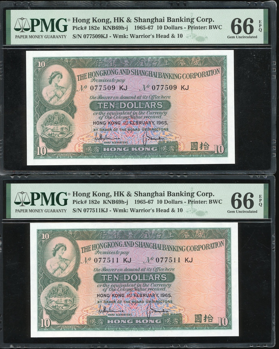 The HongKong and Shanghai Banking Corporation, a trio of $10, 1.2.1965, serial numbers 077509KJ, 077511KJ and 077512KJ, (Pick 182e), all graded PMG 66EPQ Gem Uncirculated (3)