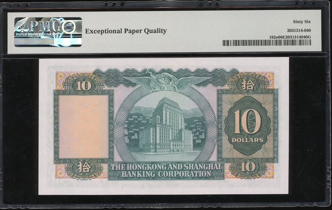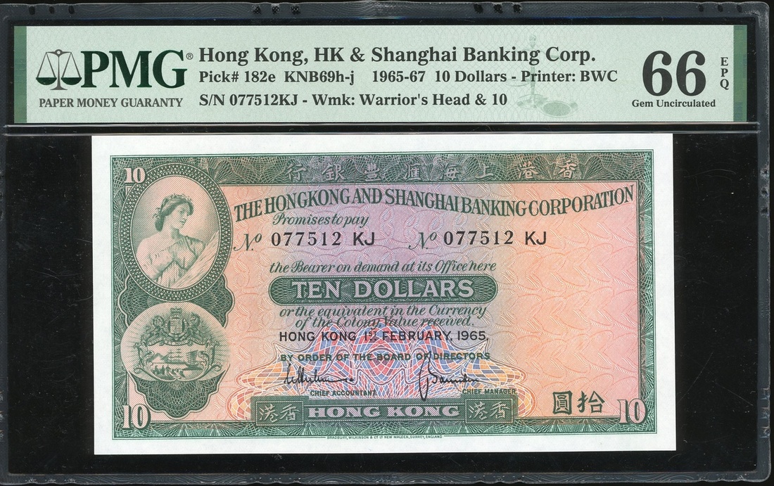 1965年香港上海匯豐銀行一組3枚10元,編號077509KJ,077511KJ及077512KJ,均PMG 66EPQ