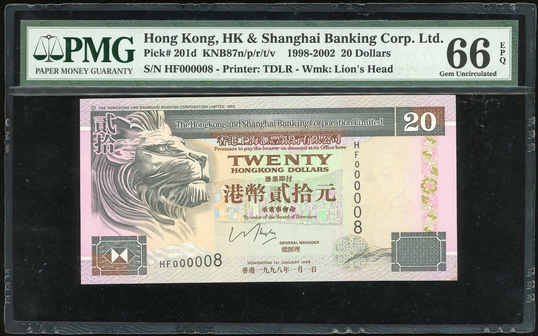 The Hongkong and Shanghai Banking Corporation, $20, 1.1.1998, low serial number HF000008, (Pick 201d), PMG 66EPQ Gem Uncirculated