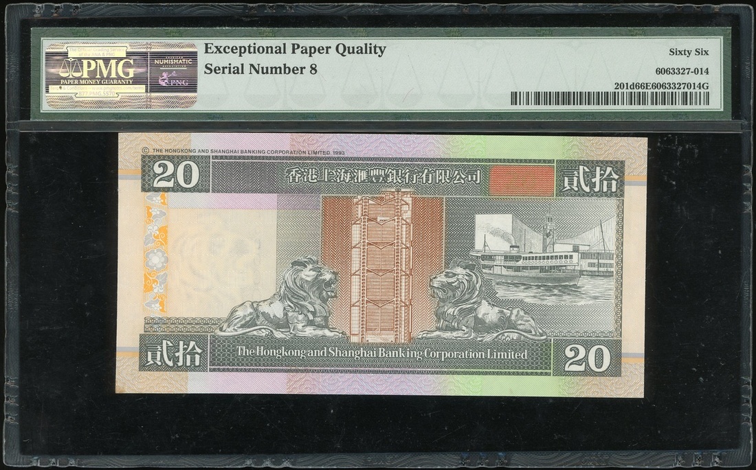 1998年香港上海匯豐銀行20元,細編號HF000008,PMG 66EPQ