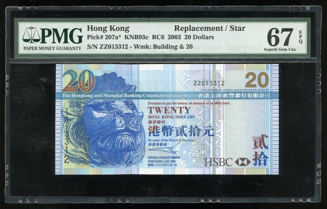 The Hongkong and Shanghai Banking Corporation, $20, replacement, 1.7.2003, serial number ZZ013312, (Pick 207a*), PMG 67EPQ Superb Gem Uncirculated