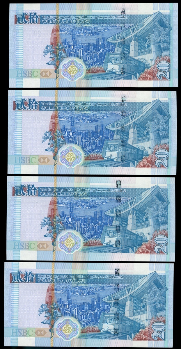 The Hongkong and Shanghai Banking Corporation, group of 4x $20, 1.7.2003, ascending ladder serial numbers DP000012, 000123, 001234 and 012345, uncirculated (4)