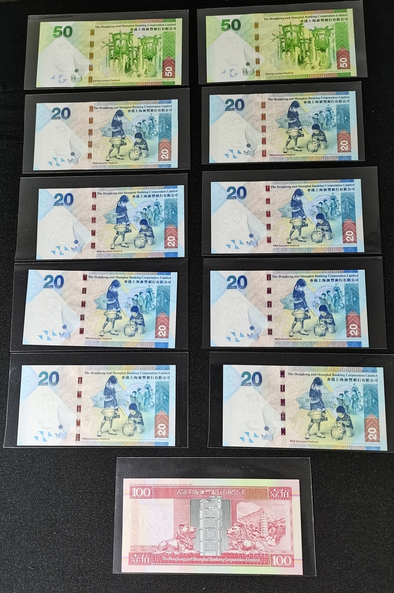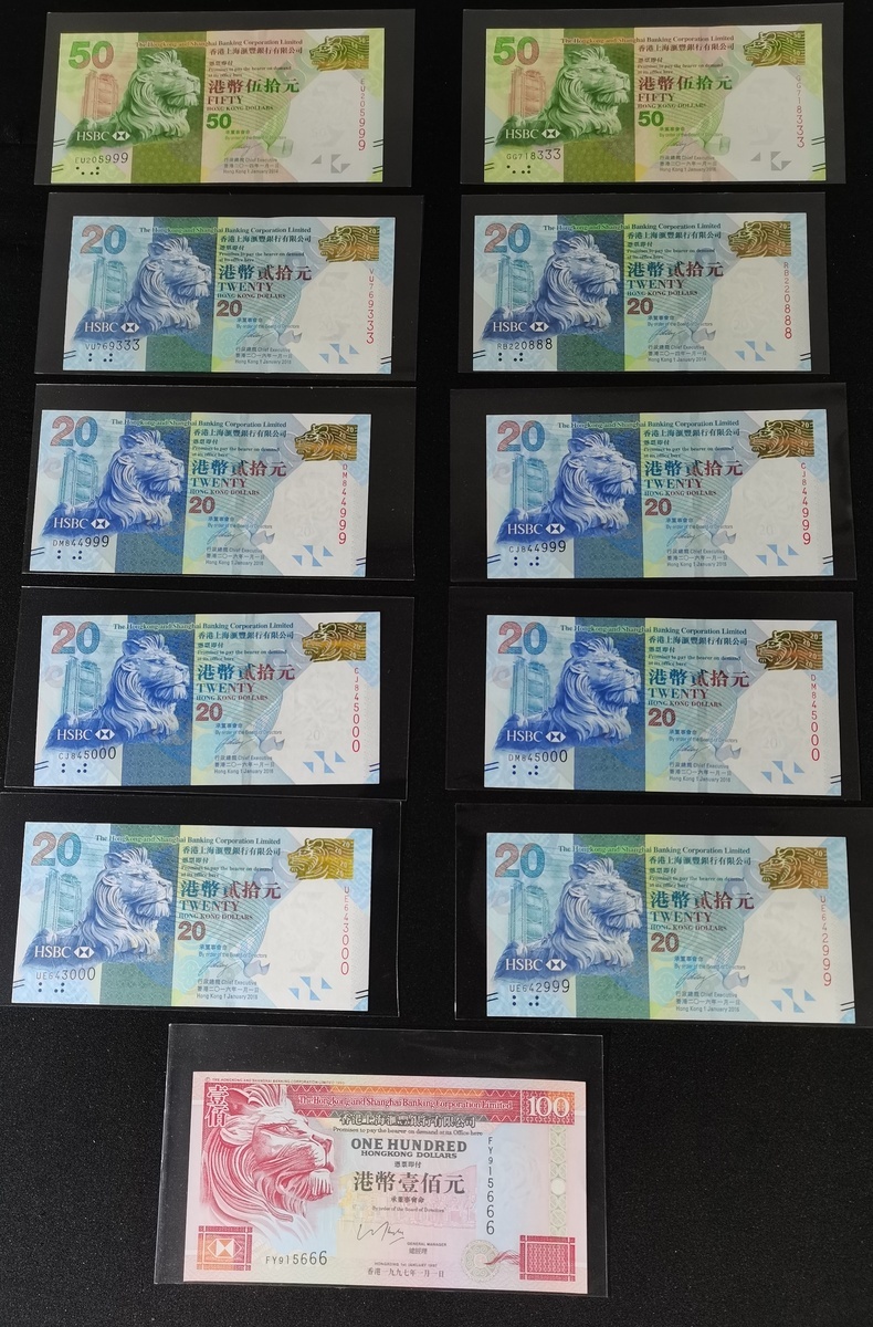 The Hongkong and Shanghai Banking Corporation, a group of 11 notes, all with fancy serial numbers, consists of 8x $20, 2014 and 2016, 2x $50, 2014 and 2016, and 1x $100, 1997, serial numbers RB220888, VU769333, DM844999, CJ844999, DM845000, UE642999, UE643000, EU205999, GG718333 and FY915666,