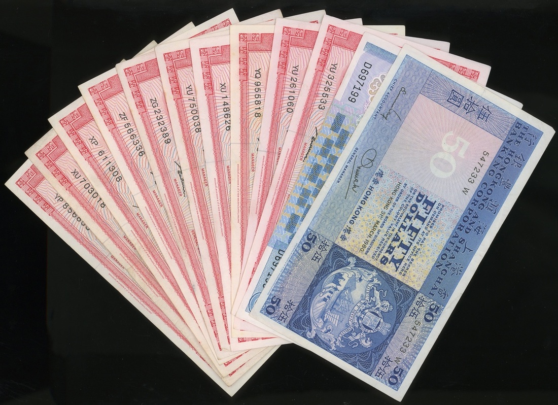 香港上海匯豐銀行及渣打銀行一組29枚100元及50元,當中兩枚為50元,其他27枚為100元,約XF品相,有褶痕,建議預覽