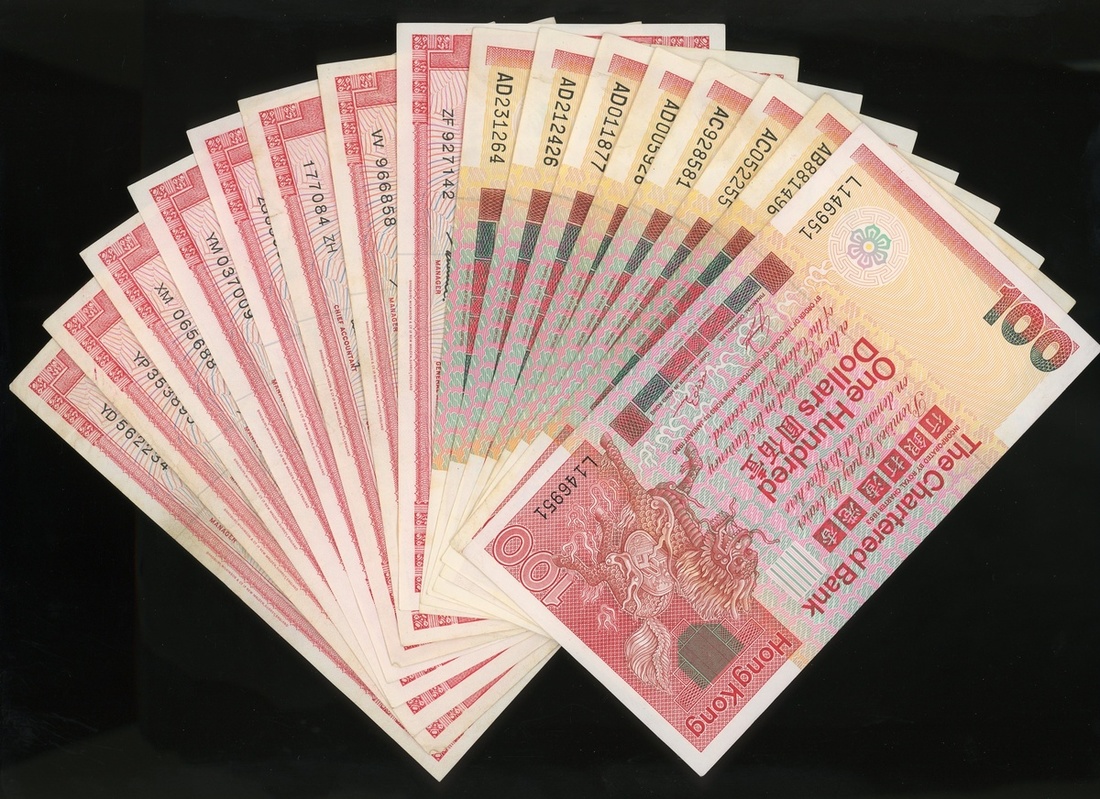 The Hongkong and Shanghai Banking Corporation and Standard Chartered Bank, a mix group of 27x 100 dollar notes and 2x 50 dollar notes, (Pick 78, 79, 184, 187) About XF condition, creases, viewing recommended (29)