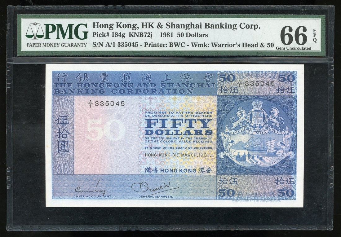 The Hongkong and Shanghai Banking Corporation, $50, 31.3.1981, serial number A/1 335045, (Pick 184g), PMG 66EPQ Gem Uncirculated