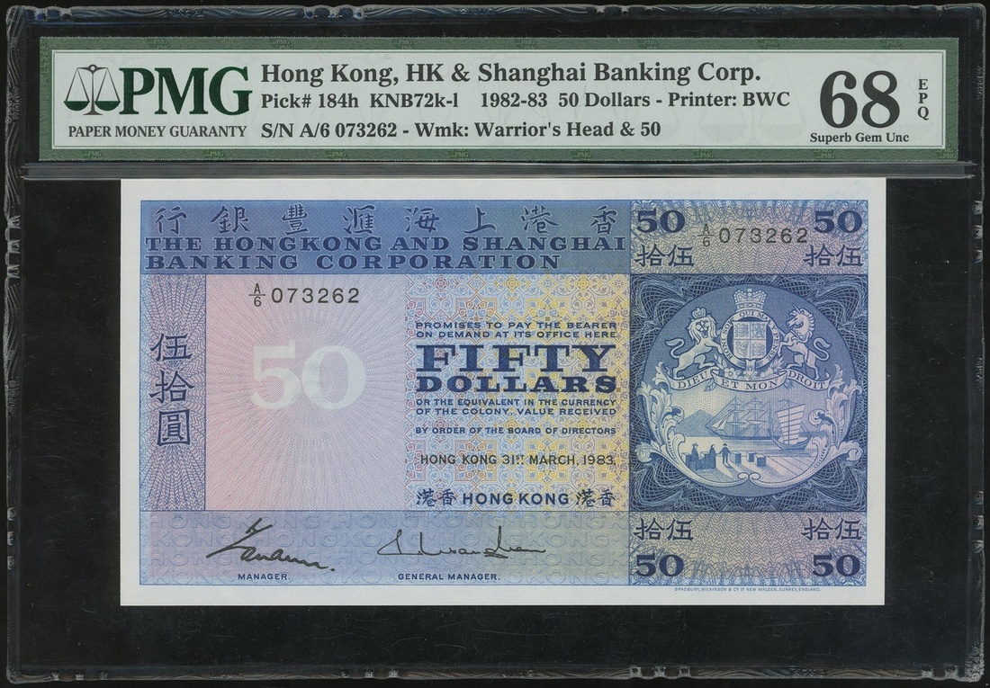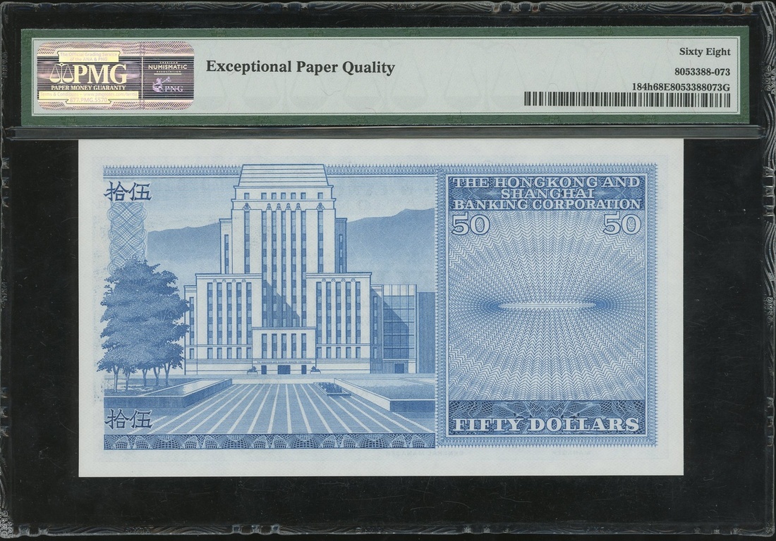 1983年香港上海匯豐銀行50元,編號A/6 073262,PMG 68EPQ,紀錄中的亞軍分,僅有兩枚獲評更高的69EPQ