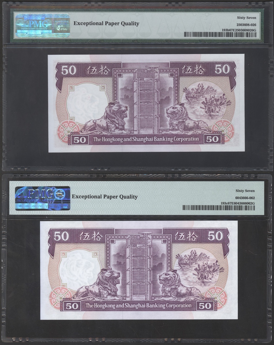 The Hongkong and Shanghai Banking Corporation, a pair of $50, 1.1.1988, serial number AQ494100 and 1.1.1992, serial number BY669213, (Pick 193b, 193c), both graded PMG 67EPQ Superb Gem Uncirculated