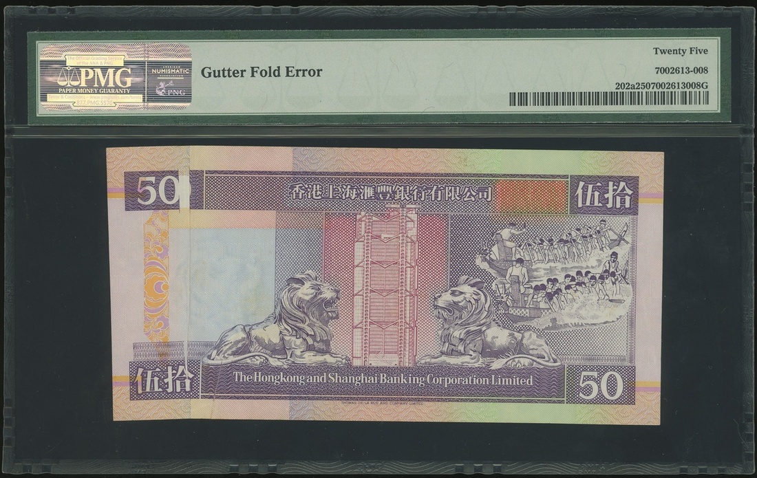 1993年香港上海匯豐銀行50元,編號AL204355,褶白錯體,PMG 25,現代香港紙幣當中非常少見的錯體票