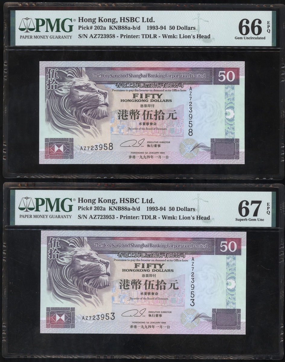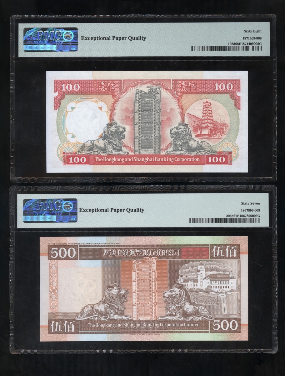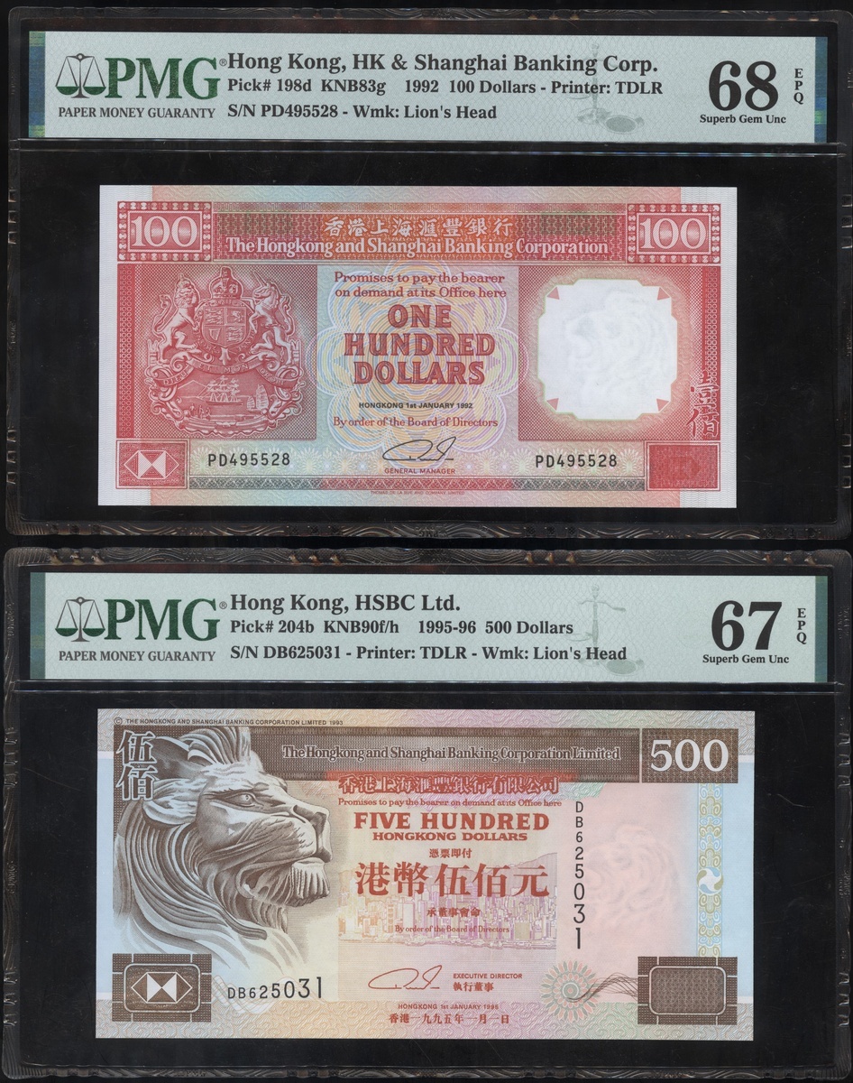 The Hongkong and Shanghai Banking Corporation, a group of 6 notes, consists of 2x $50, 1.1.1994, 3x $100, 1.1.1989 and 1.1.1992, and 1x $500, serial numbers AZ723953, AZ723958, GW357394-95, PD495528 and DB625031, (Pick 202a, 198a, 198d and 204b), graded PMG 66EPQ-68EPQ (6).