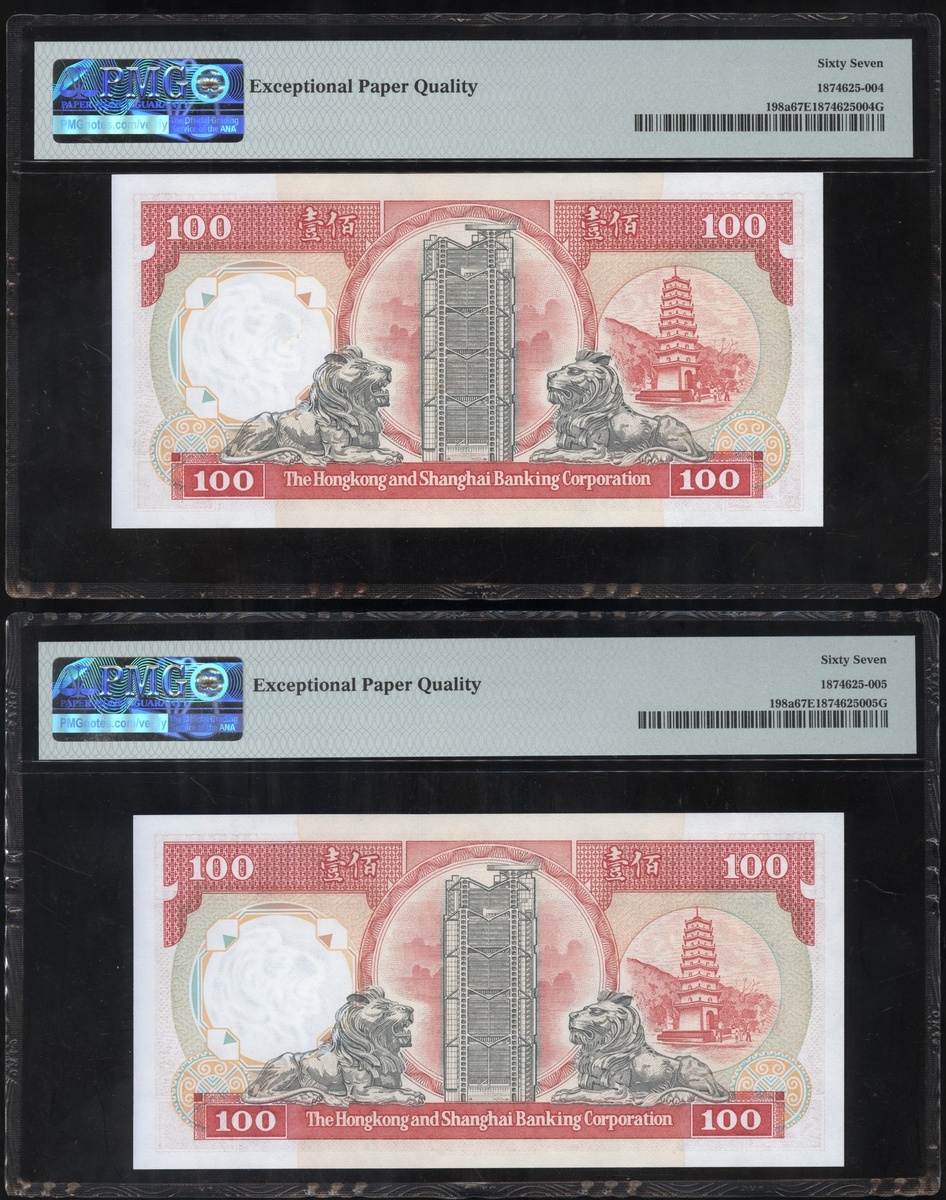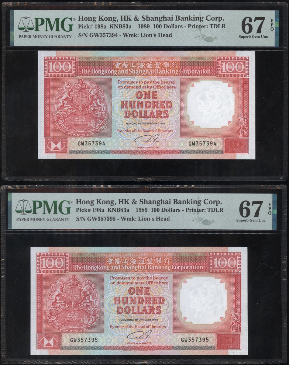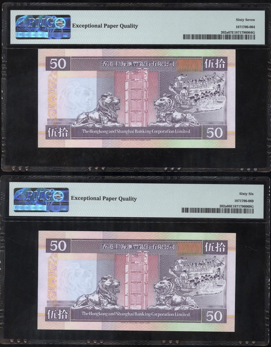The Hongkong and Shanghai Banking Corporation, a group of 6 notes, consists of 2x $50, 1.1.1994, 3x $100, 1.1.1989 and 1.1.1992, and 1x $500, serial numbers AZ723953, AZ723958, GW357394-95, PD495528 and DB625031, (Pick 202a, 198a, 198d and 204b), graded PMG 66EPQ-68EPQ (6).