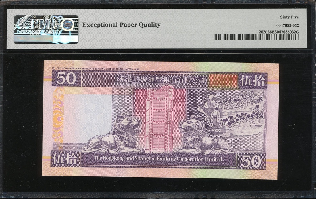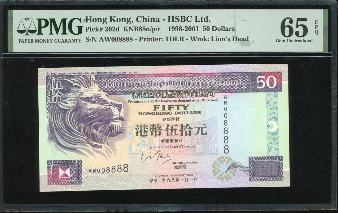 1998年香港上海匯豐銀行50元,編號AW008888,PMG65EPQ