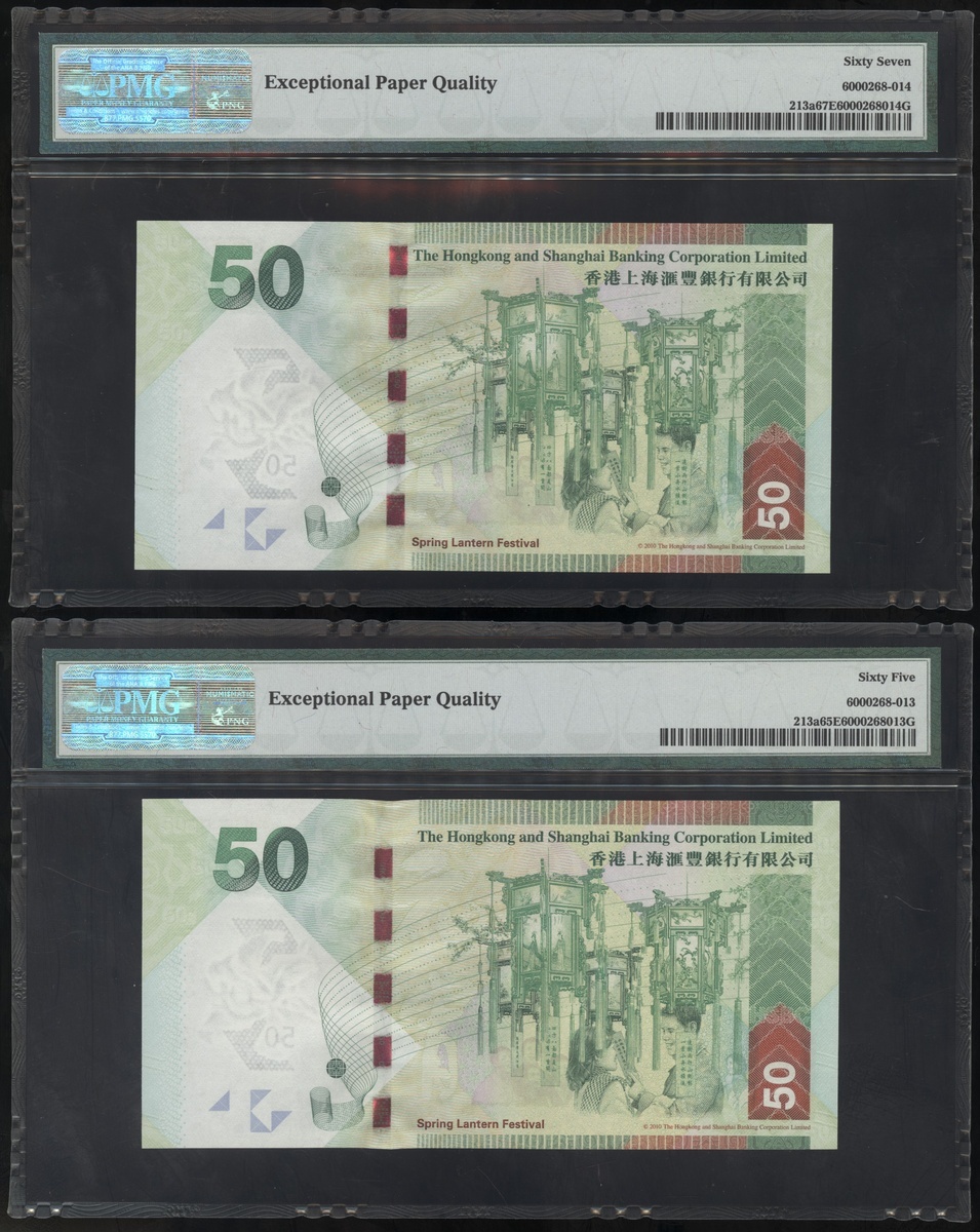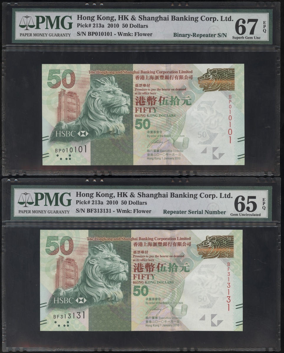 2010年香港上海匯豐銀行50元,重複編號BP010101及BF313131,均PMG65EPQ-67EPQ(2)