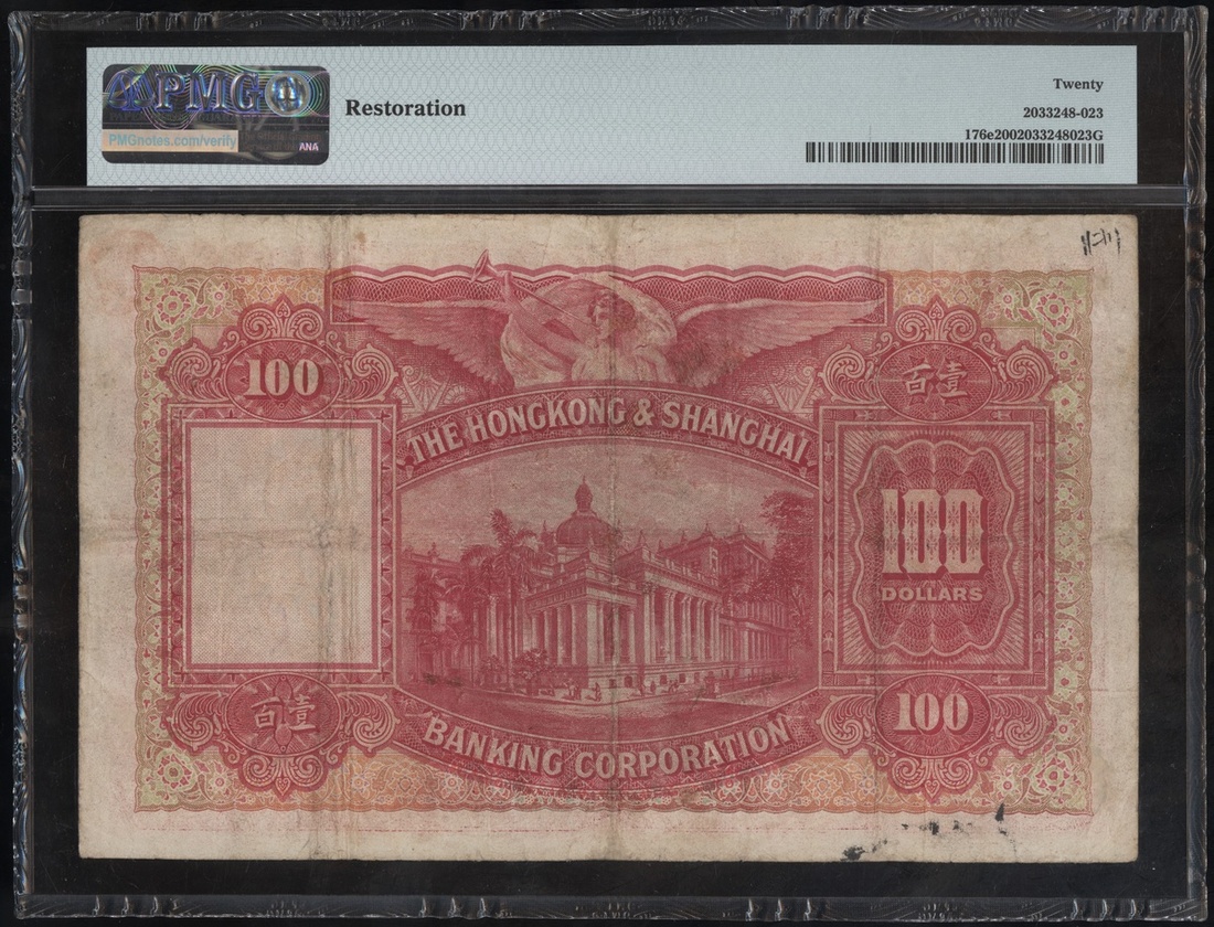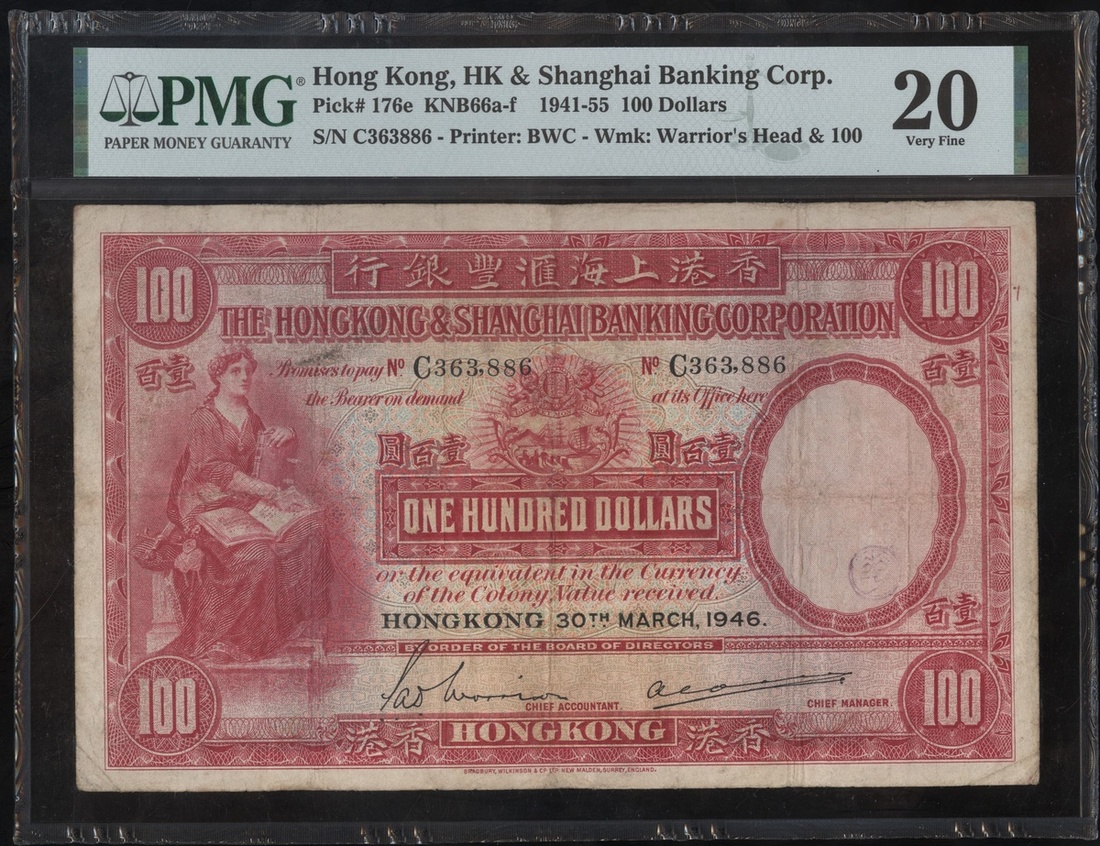 The Hongkong & Shanghai Banking Coporation, $100, 30.3.1946, serial number C363886, (Pick 176e), PMG 20 Very Fine (Restoration).