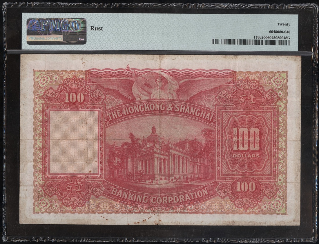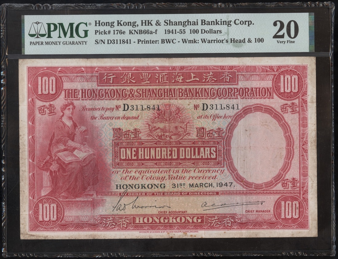 The Hongkong & Shanghai Banking Corporation, 100 Dollars, 31.3.1947, serial number D311841, red and multicoloured, Justitia at left, reverse bank building, (Pick 176e), PMG 20 Very Fine