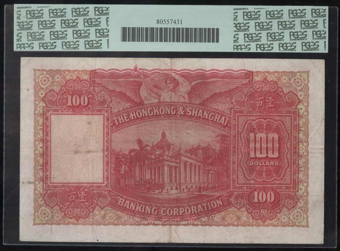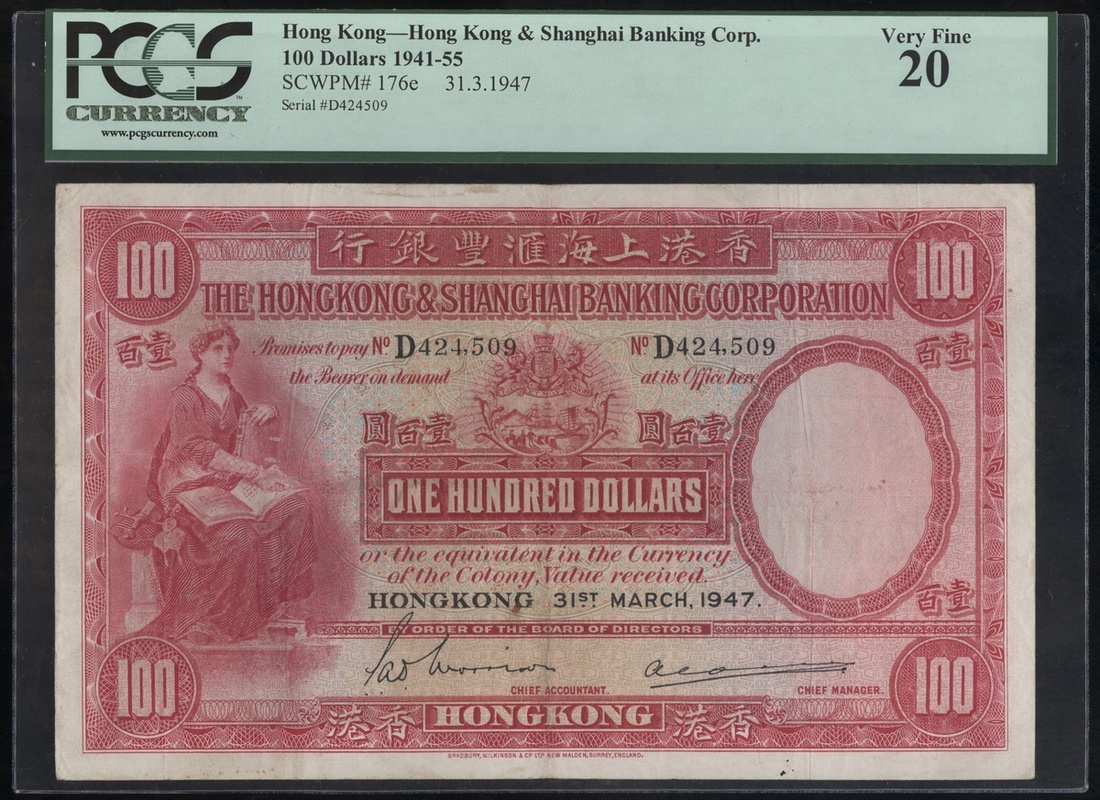 The Hongkong & Shanghai Banking Corporation, 100 Dollars, 31.3.1947, serial number D424509, red and multicoloured, Justitia at left, reverse bank building, (Pick 176e), PCGS Currency 20 Very Fine