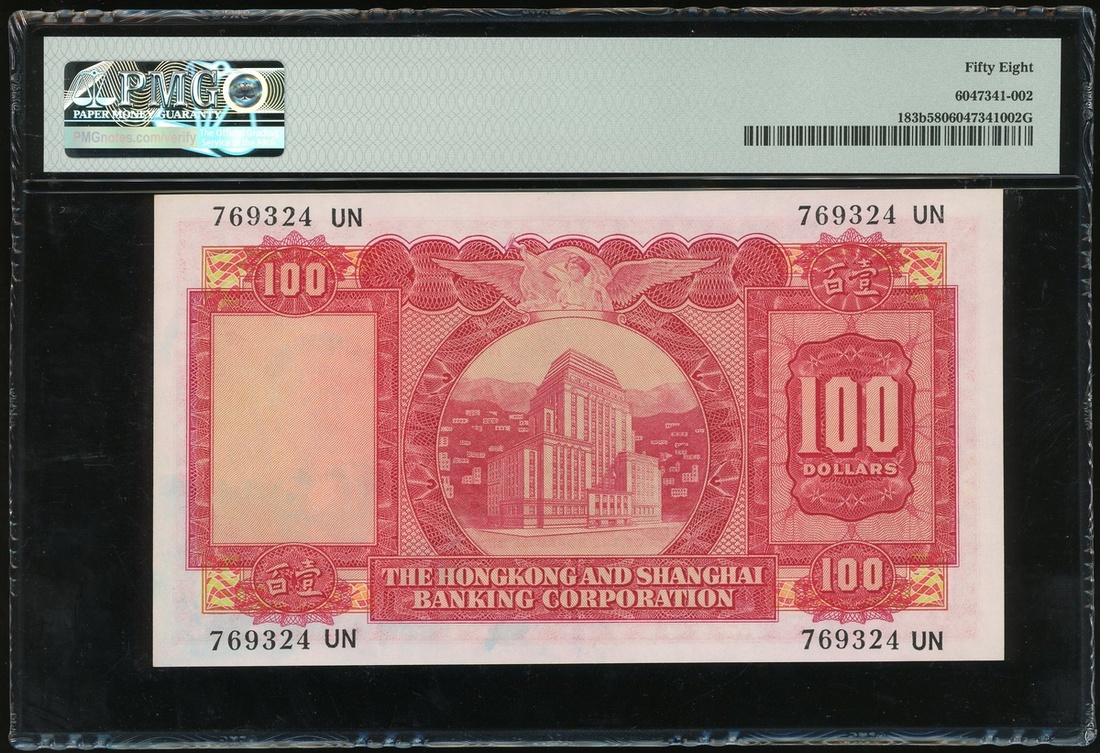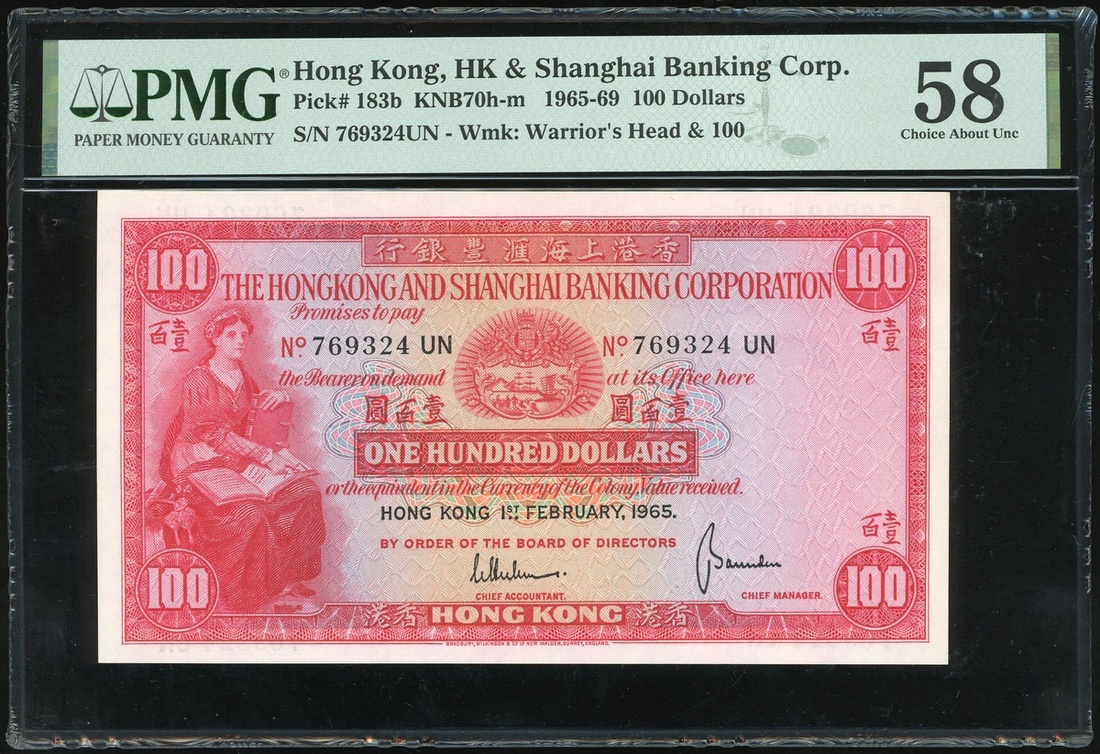 The Hongkong and Shanghai Banking Corporation, $100, 1.2.1965, serial number 769324 UN, (Pick 183b), PMG 58 Choice About Uncirculated