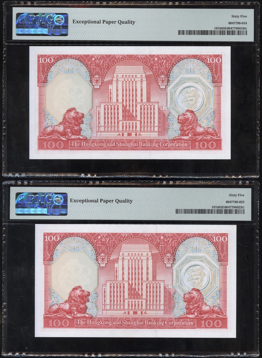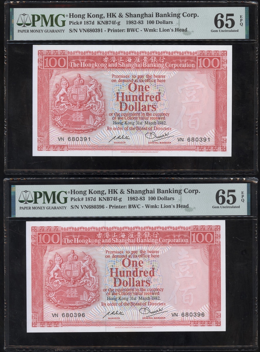 1982年香港上海匯豐銀行100元一組兩枚,編號VN680391及VN680396,均PMG 65EPQ(2)