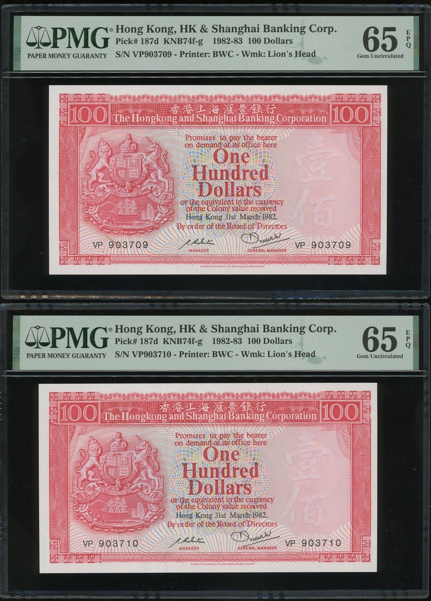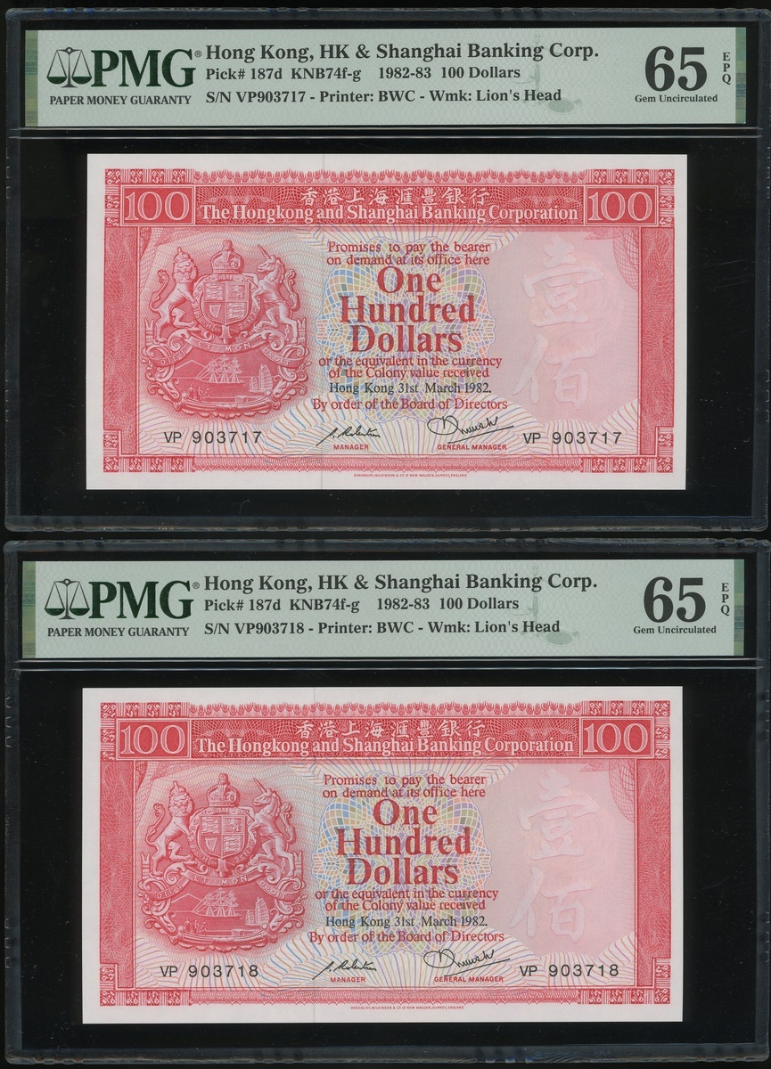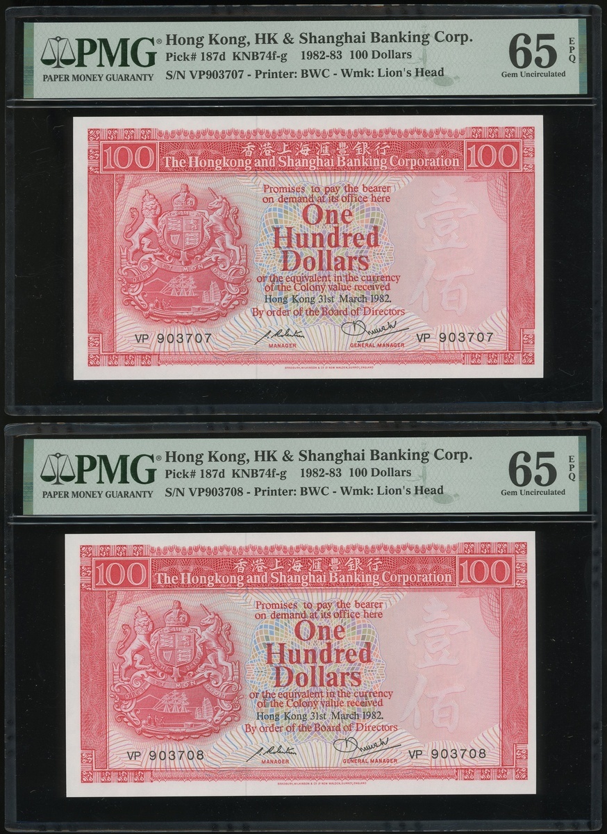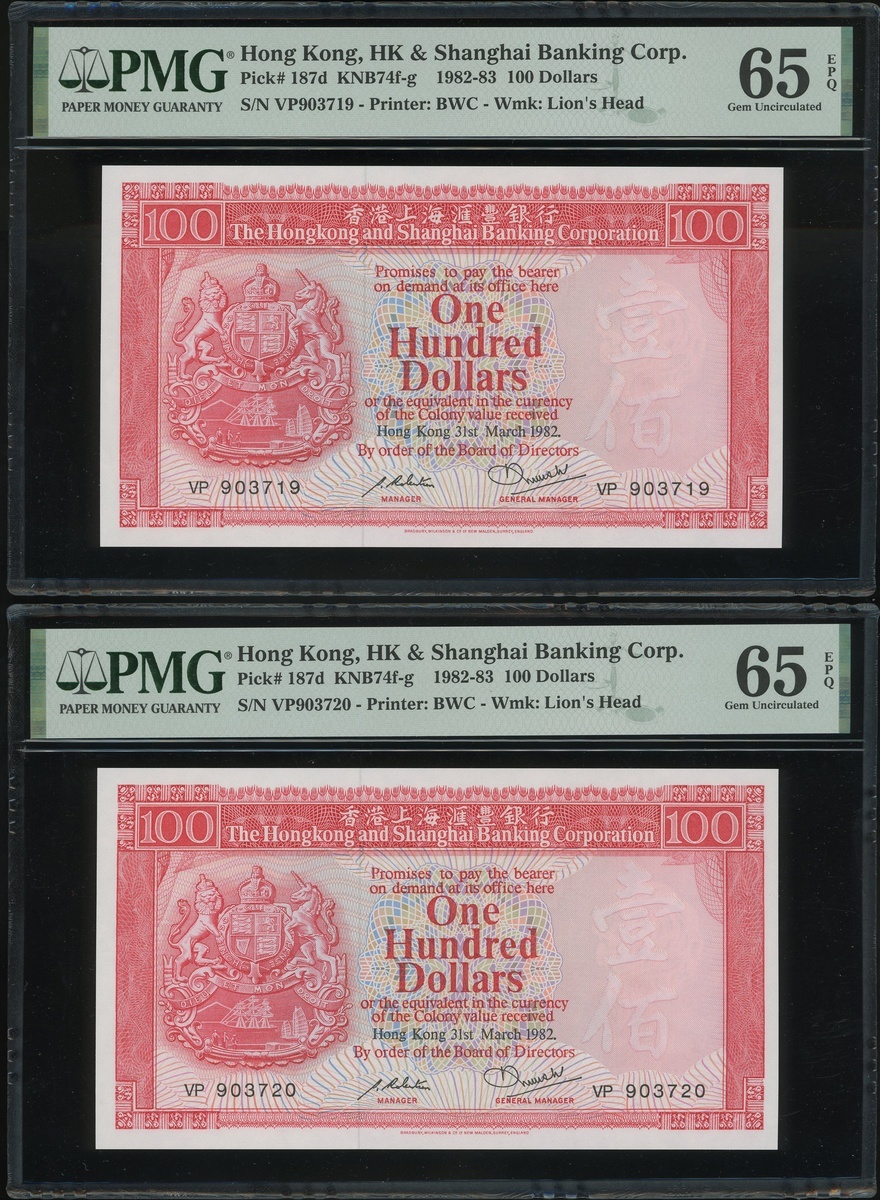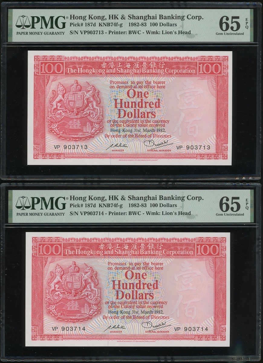 1982年香港上海匯豐銀行100元二十枚連號,編號VP903701-903720,均PMG65EPQ(20)