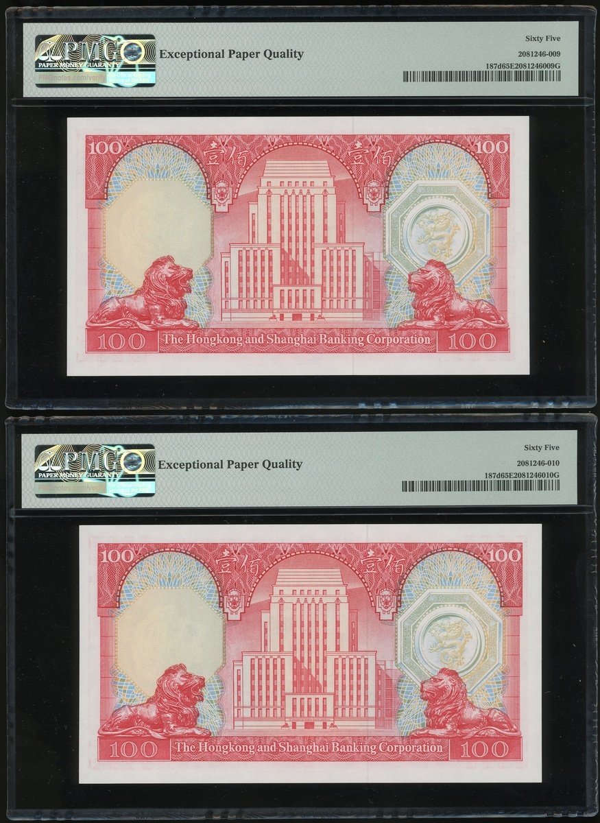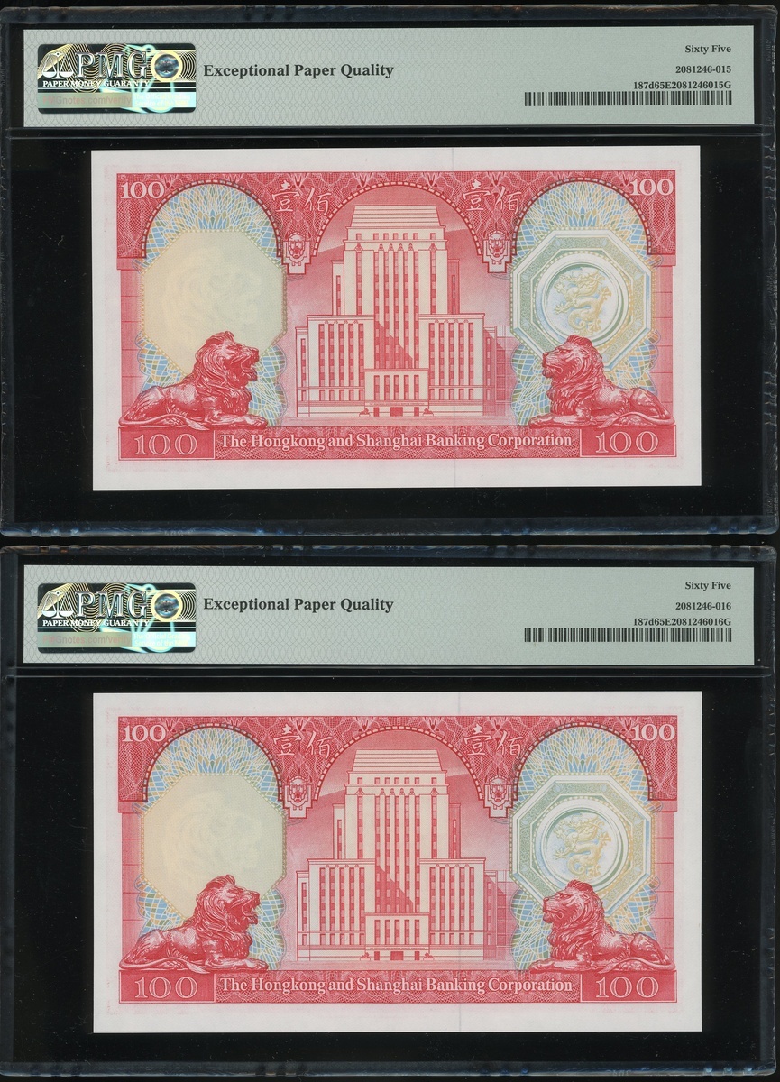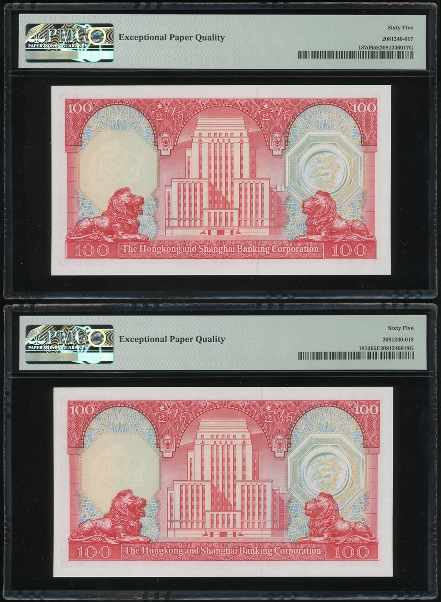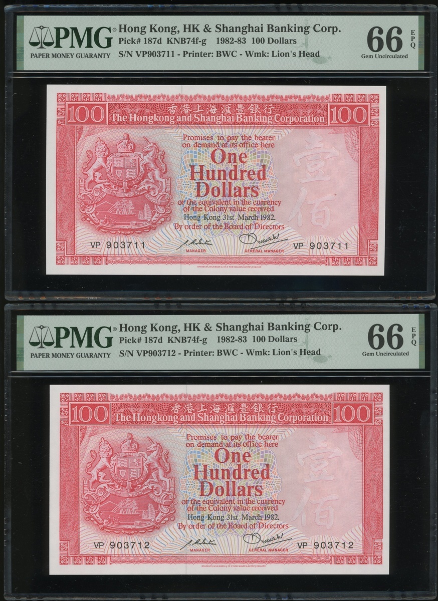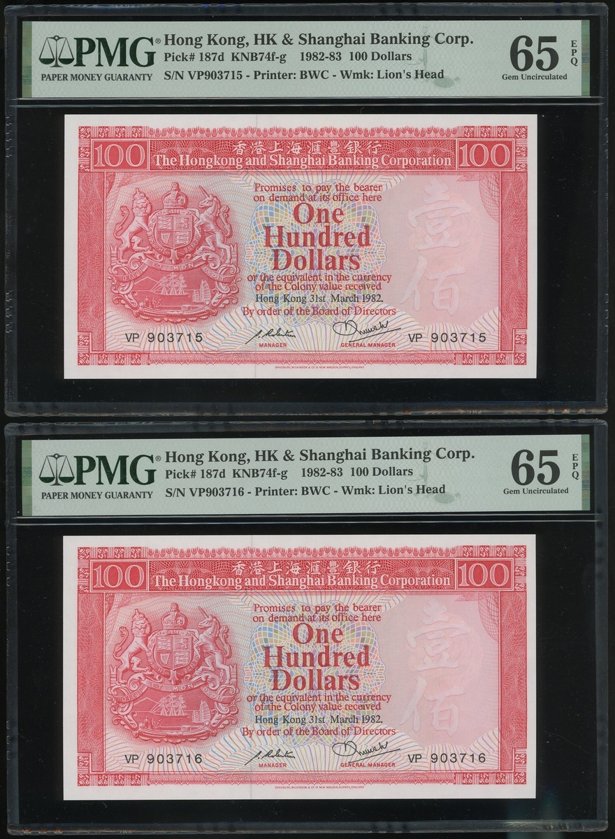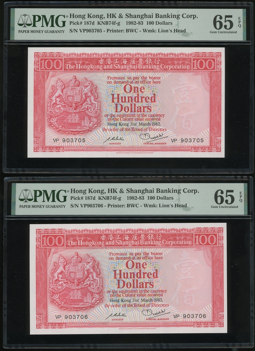 1982年香港上海匯豐銀行100元二十枚連號,編號VP903701-903720,均PMG65EPQ(20)