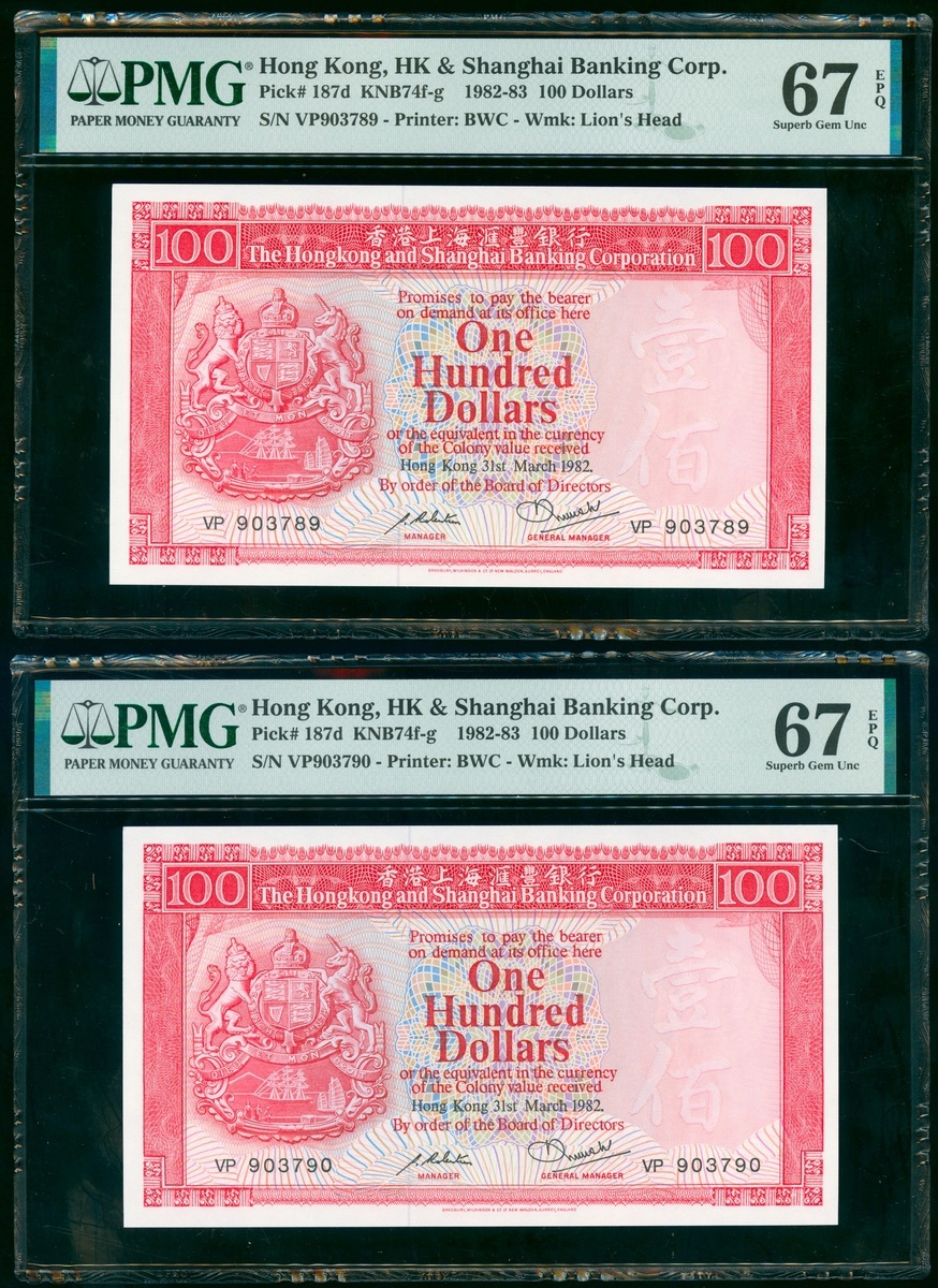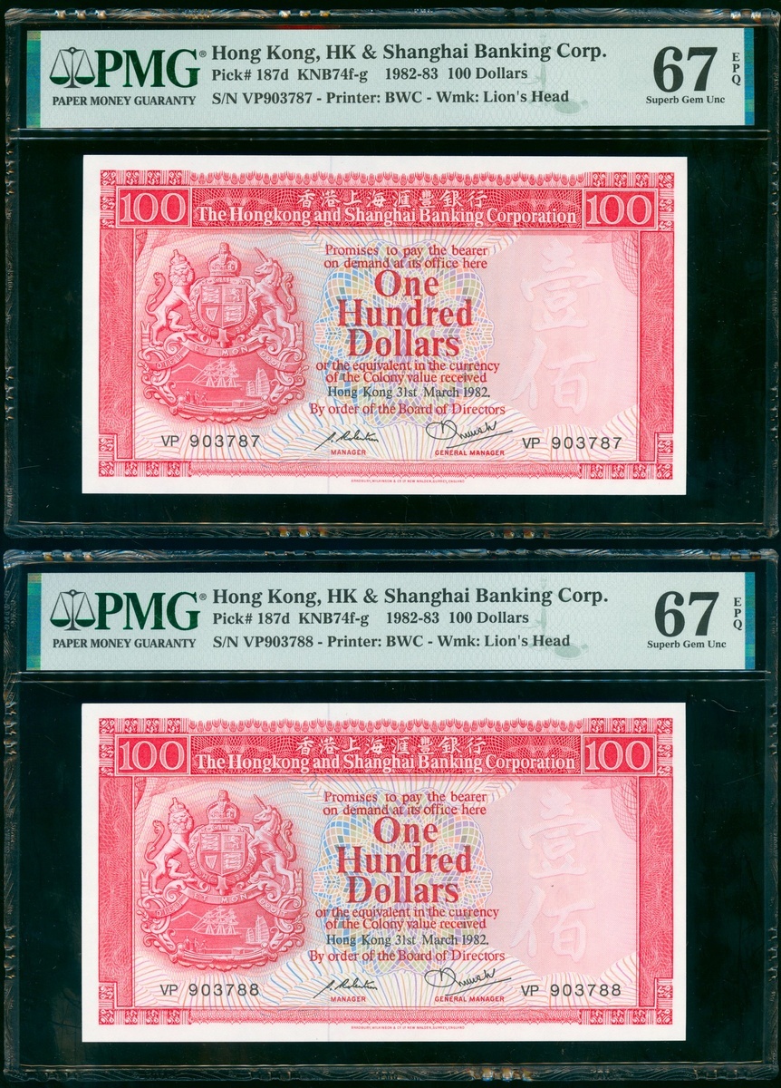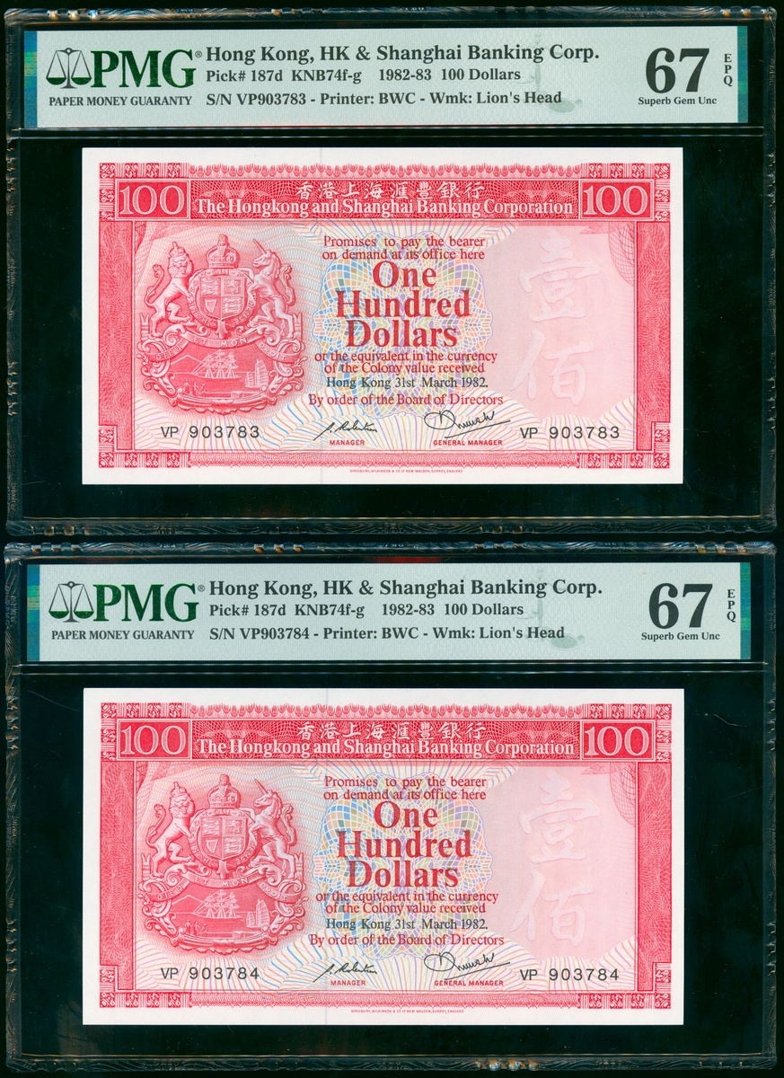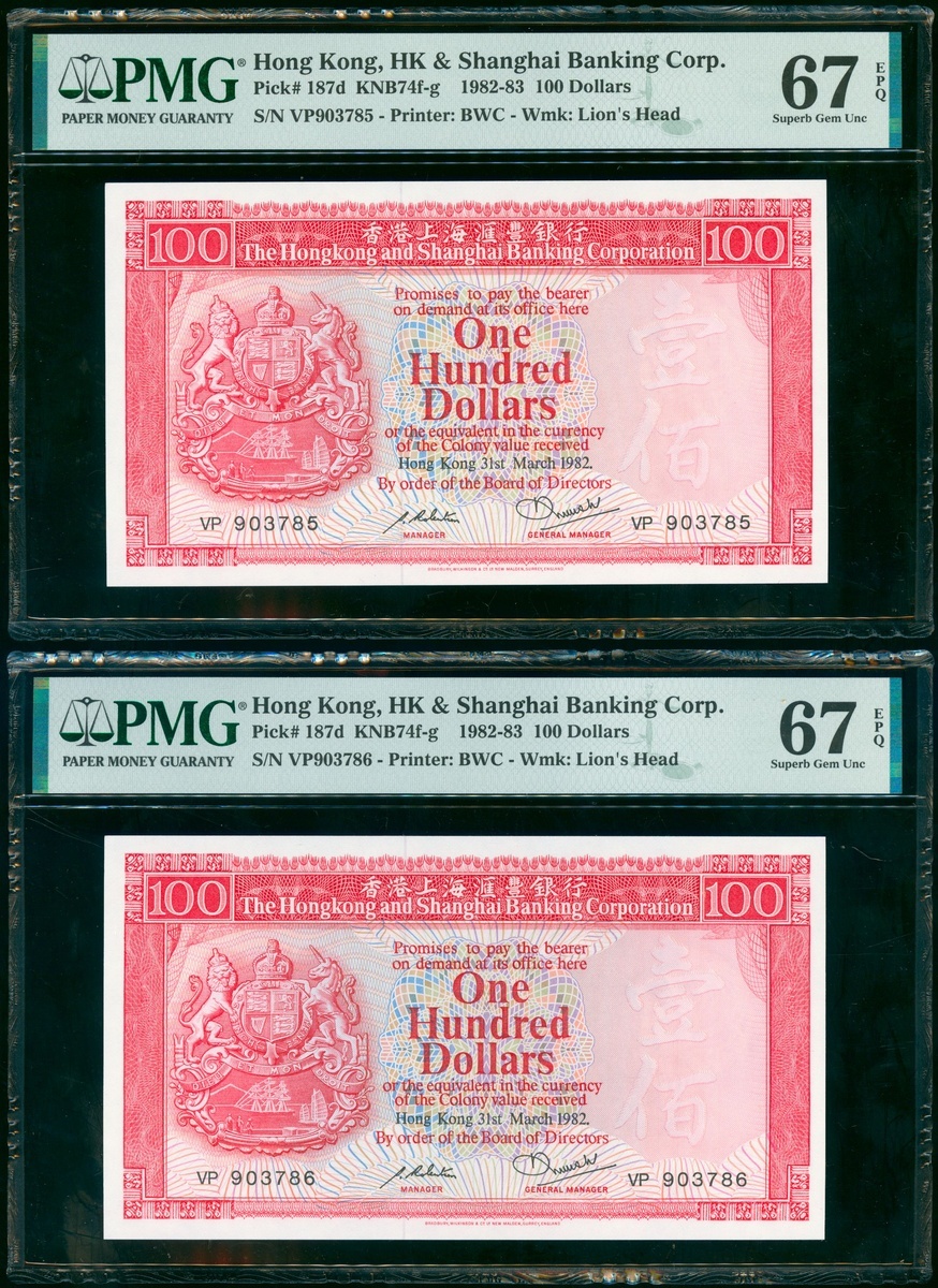 1982年香港上海匯豐銀行100元二十枚連號,編號VP903781-903800,PMG 66EPQ-67EPQ(20)