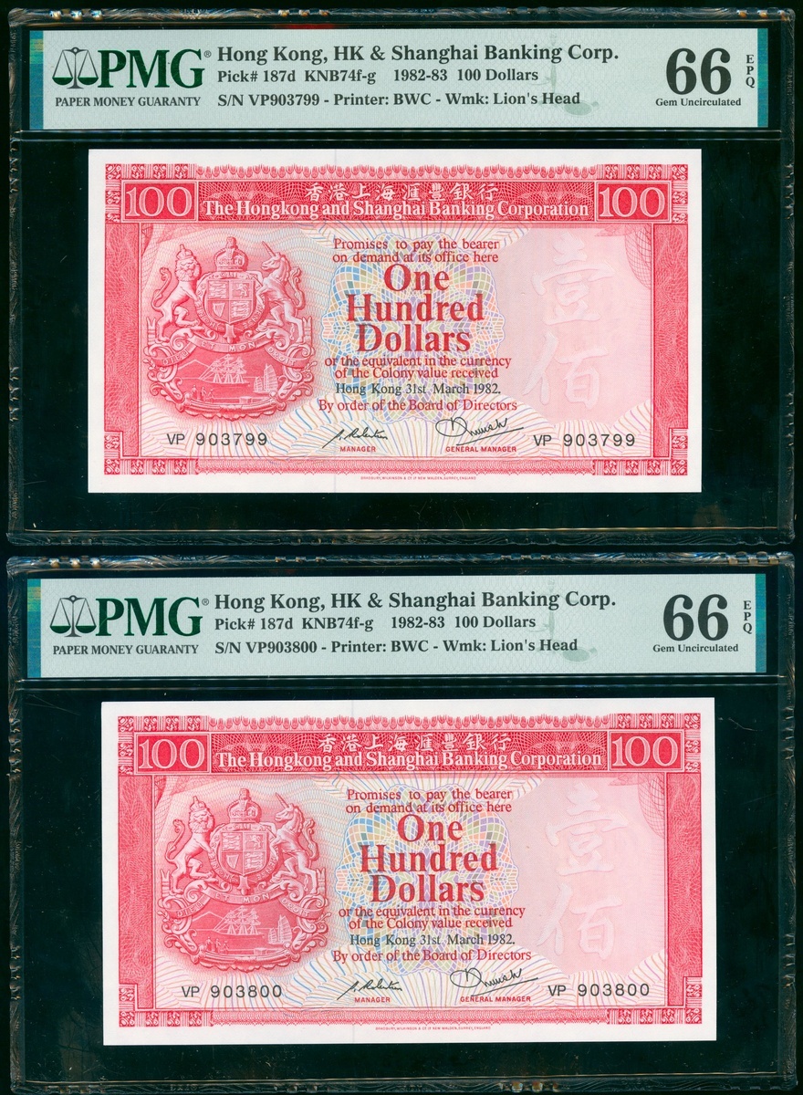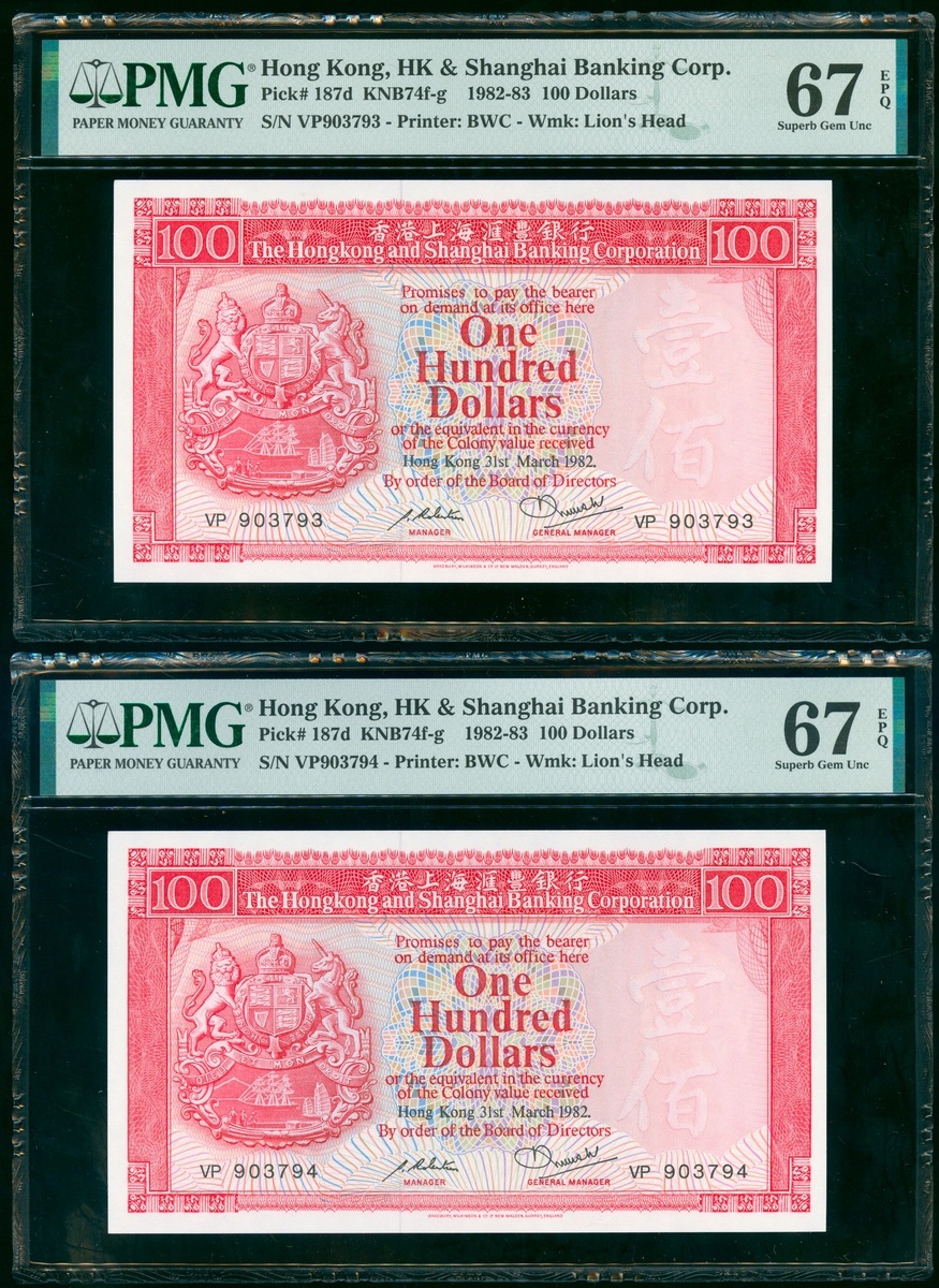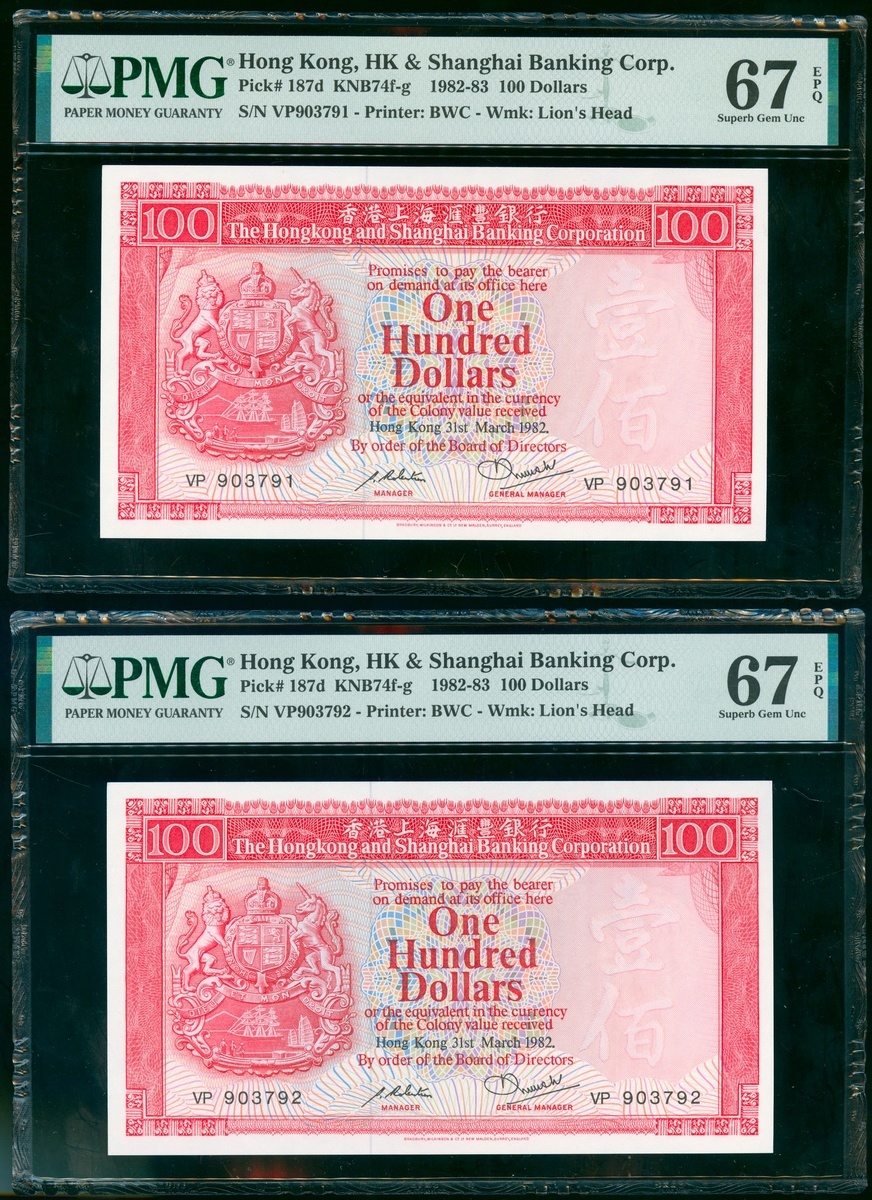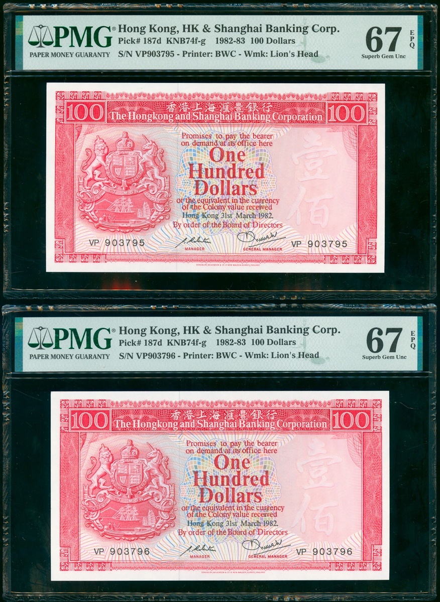 1982年香港上海匯豐銀行100元二十枚連號,編號VP903781-903800,PMG 66EPQ-67EPQ(20)