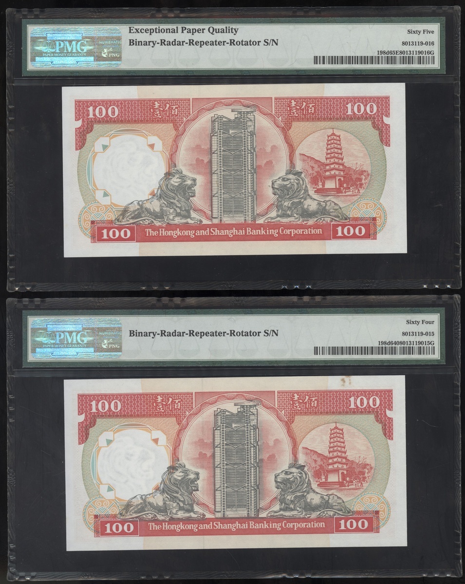 1992年香港上海匯豐銀行100元一組兩枚,編號QM101101及QP101101,均PMG64-65EPQ(2)