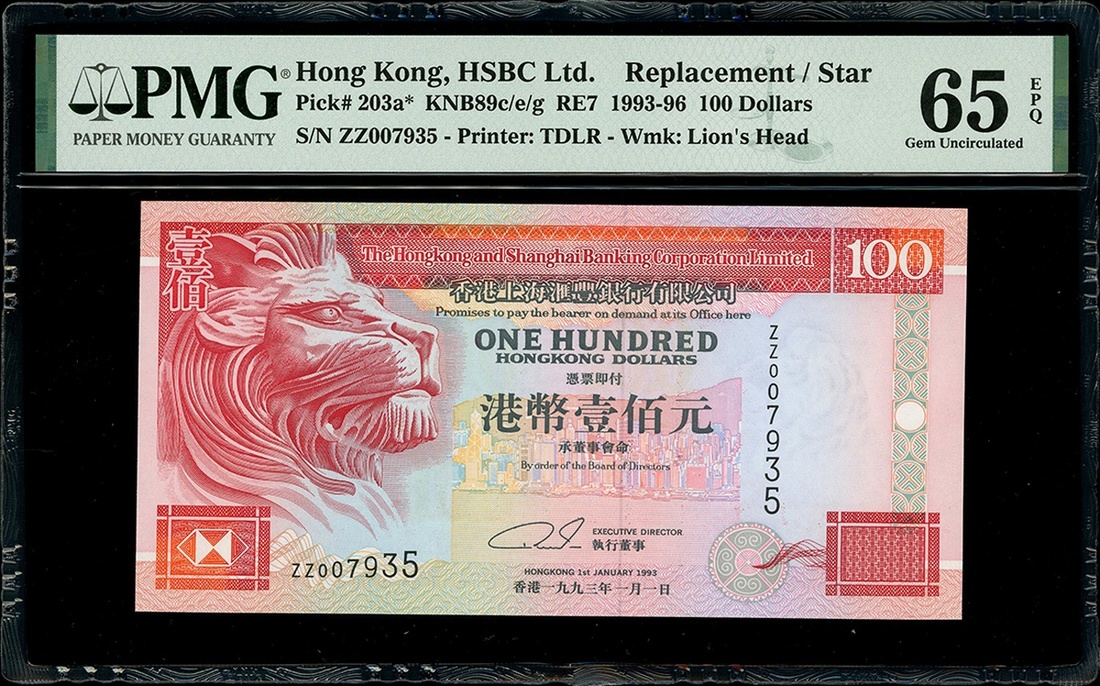 Hong Kong & Shanghai Banking Corporation, a pair of $100, 1st January 1993 and 1st July 2003, replacement, serial numbers ZZ007935 and ZZ017235, (Pick 203a*, 209a*), graded PMG 65EPQ and 66EPQ respectively. (2)