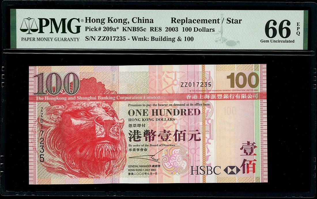 1993年及2003年匯豐銀行補版100元2枚一組,編號ZZ007935及 ZZ017235,分別評PMG 65EPQ及66EPQ