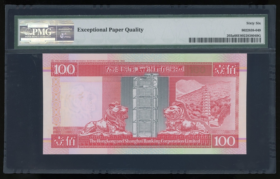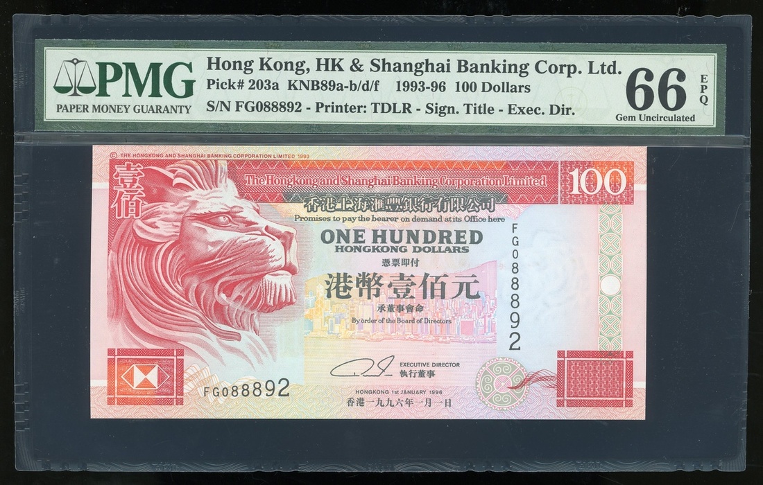 1996年香港上海匯豐銀行100元,編號FG088892,PMG 66EPQ