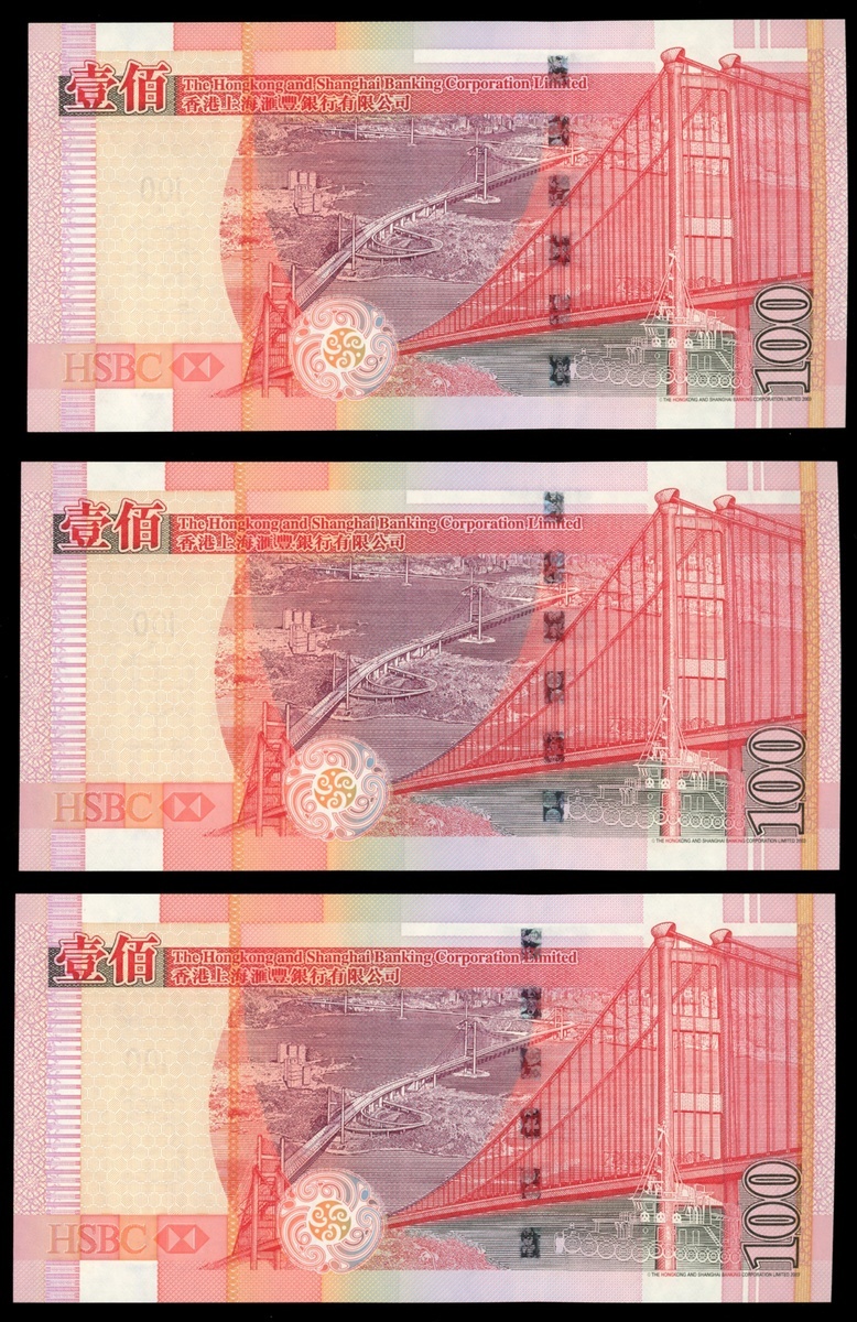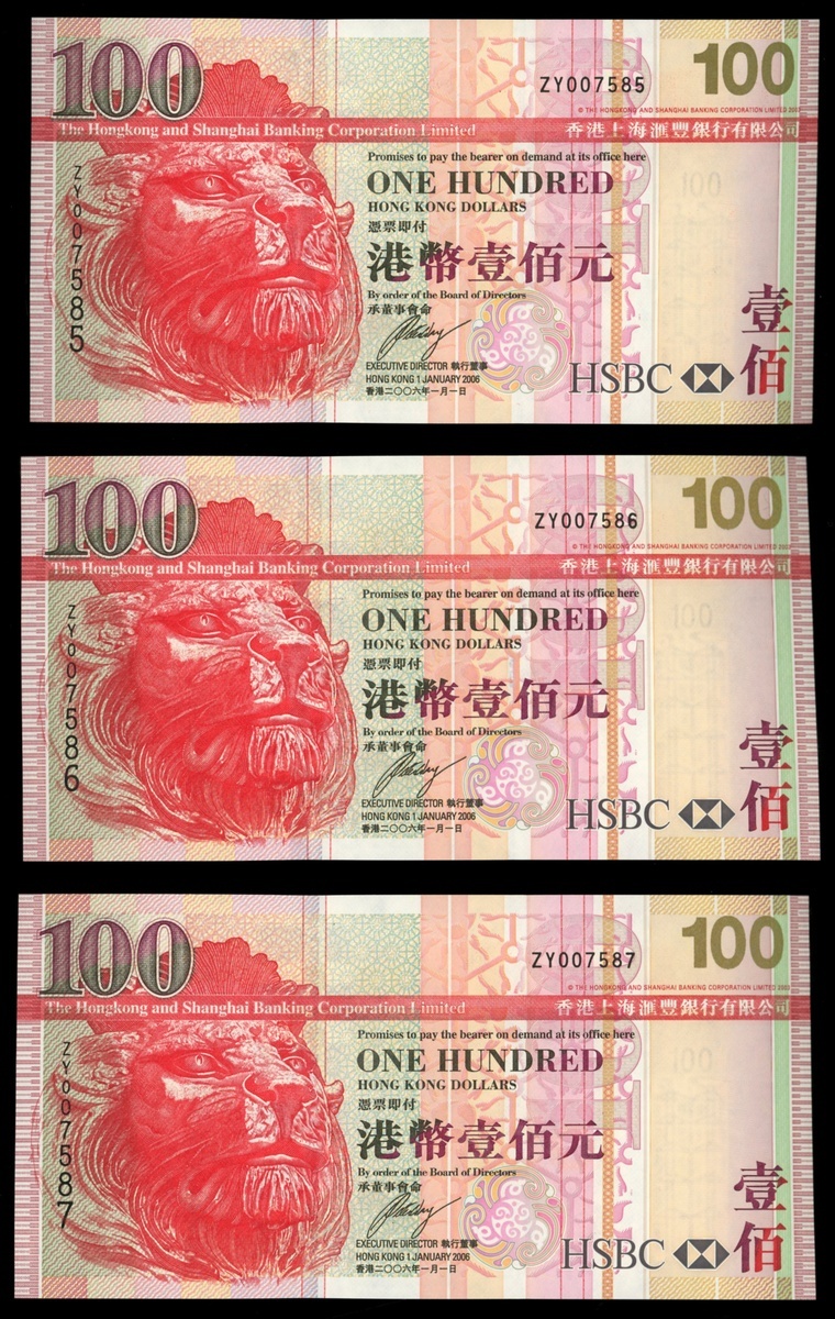 The Hongkong and Shanghai Banking Corporation, group of 6x $100, 1.1.2006, near consecutive run of replacement notes ZY007585-590, uncirculated (6)