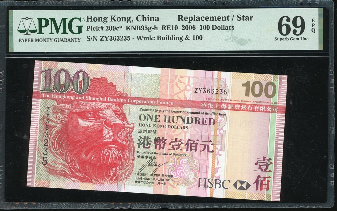 The Hongkong and Shanghai Banking Corporation, $100, 1.1.2006, replacement serial number ZY363235, (Pick 209c*), PMG 69EPQ Superb Gem Uncirculated