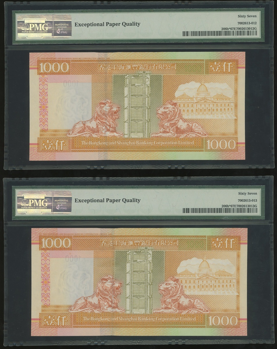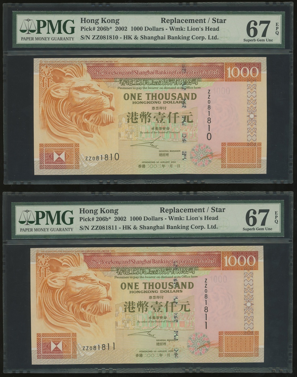 The Hongkong and Shanghai Banking Corporation, a pair of $1000, 1.1.2002, consecutive replacement serial numbers ZZ081810 and ZZ081811, (Pick 206b*), both graded PMG 67EPQ Superb Gem Uncirculated (2)