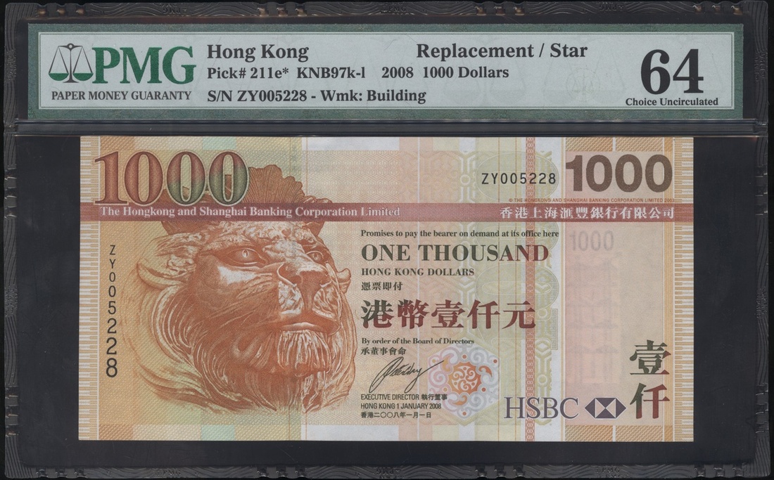 The Hongkong and Shanghai Banking Corporation Limited, $1000, replacement, 1.1.2008, serial number ZY005228, (Pick 211e*), PMG 64 Choice Uncirculated.