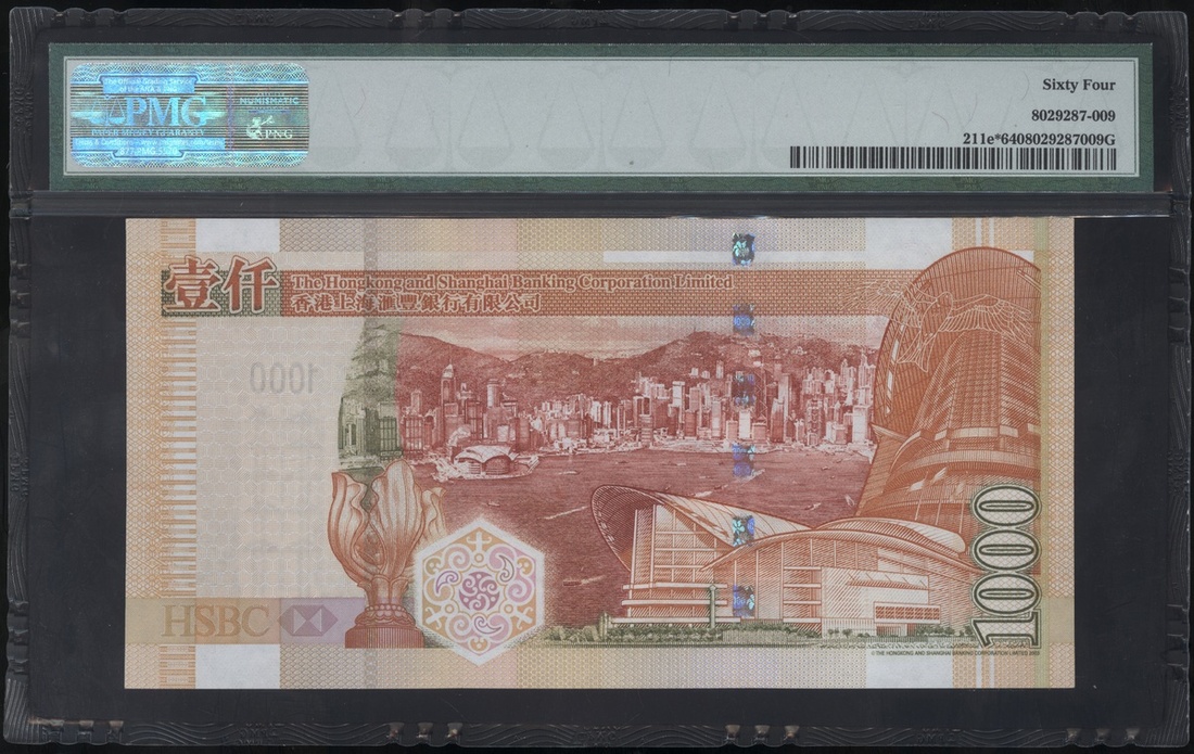 2008年香港上海匯豐銀行 1000元補版,編號ZY005228,PMG 64
