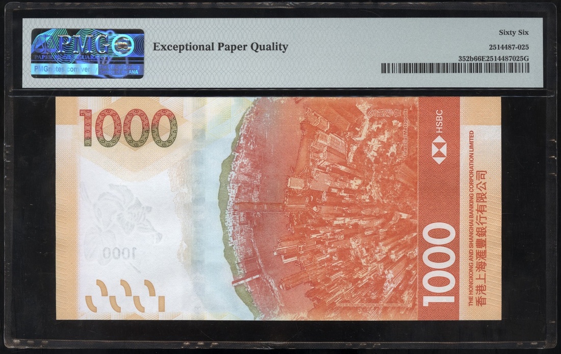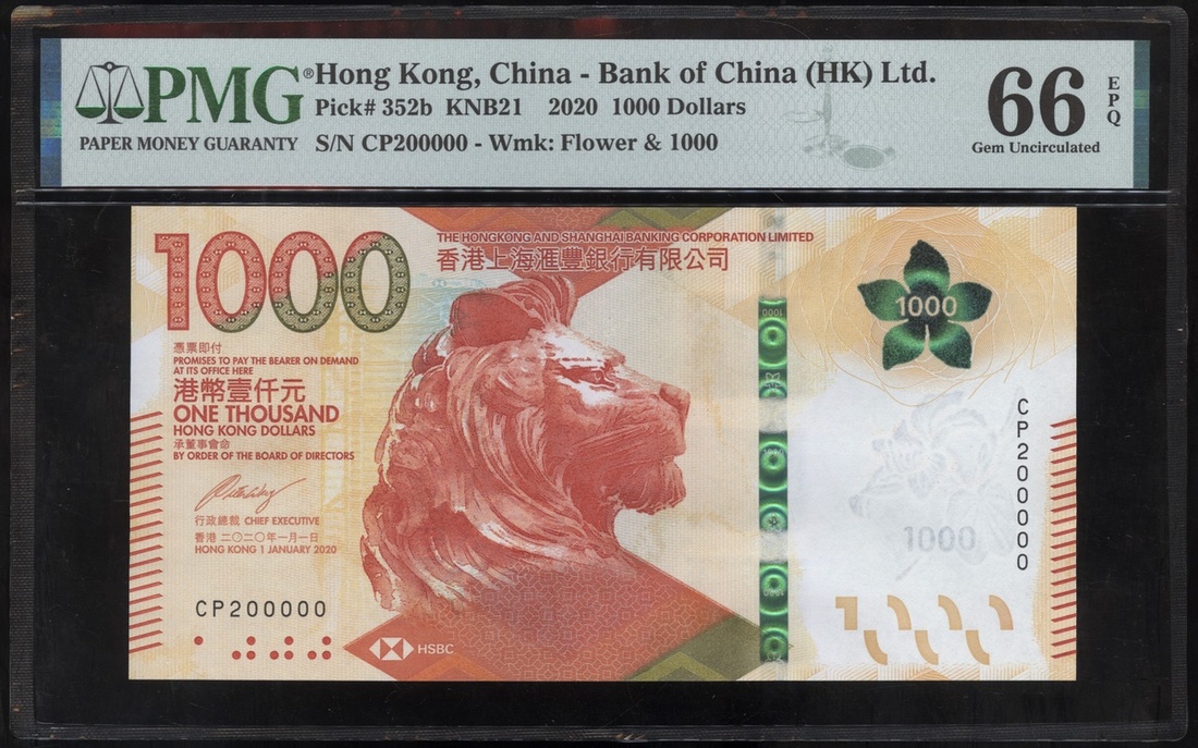 The Hong Kong and Shanghai Banking Corporation, $1000, 1.1.2020, fancy serial number CP200000, (Pick 352b), PMG 66EPQ Gem Uncirculated, mislabelled as Bank of China (HK) Ltd.
