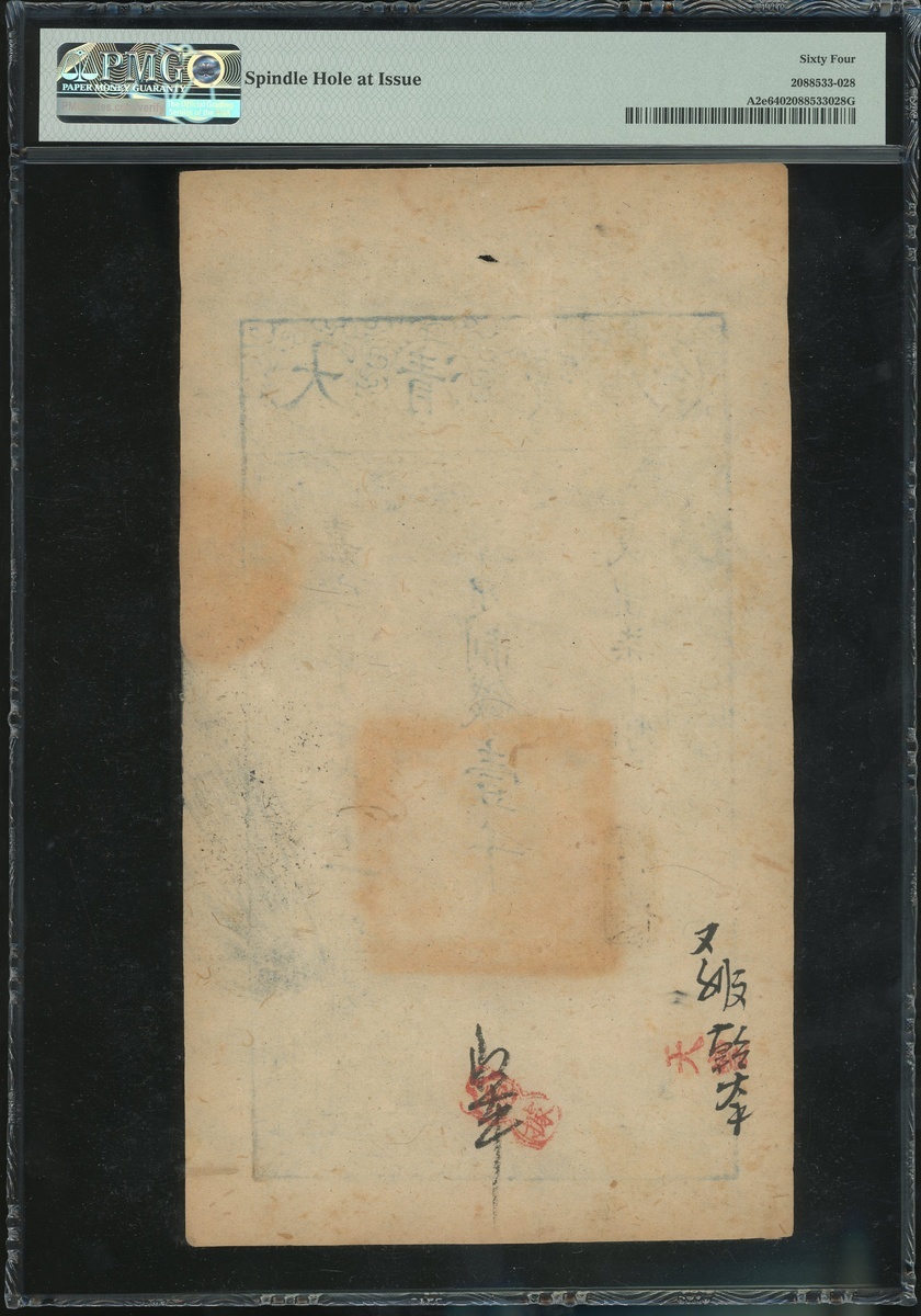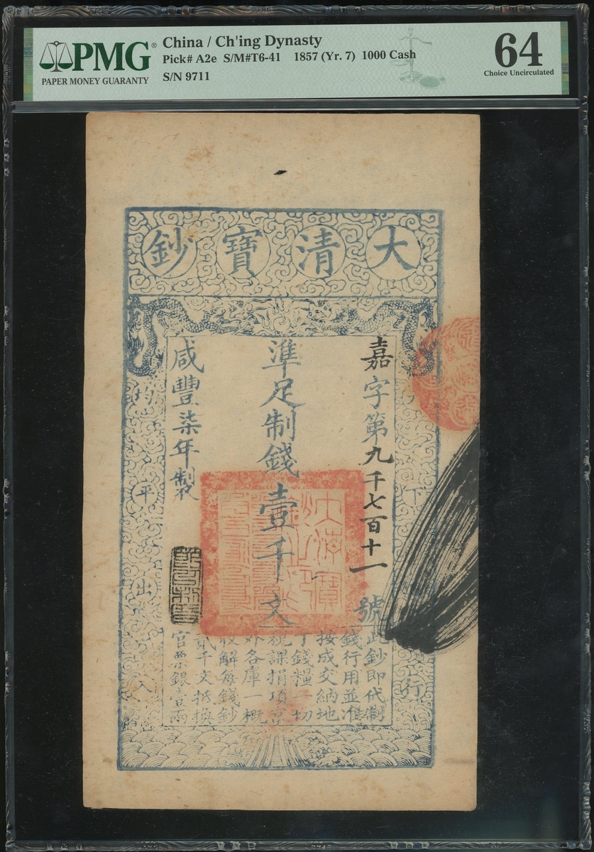 Qing Dynasty, Da Qing Bao Chao, 1000 cash, Year 7 (1857), serial number 9711, (Pick A2e), PMG 64 Choice Uncirculated (Spindle Hole at Issue)