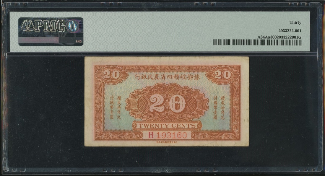 1933年四省農民銀行貳角,編號B193160,PMG 30,PMG僅得4枚紀錄,只有1枚獲評更高分數,罕見