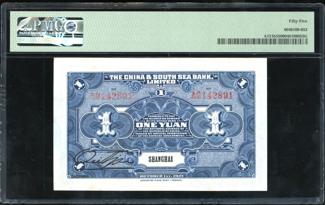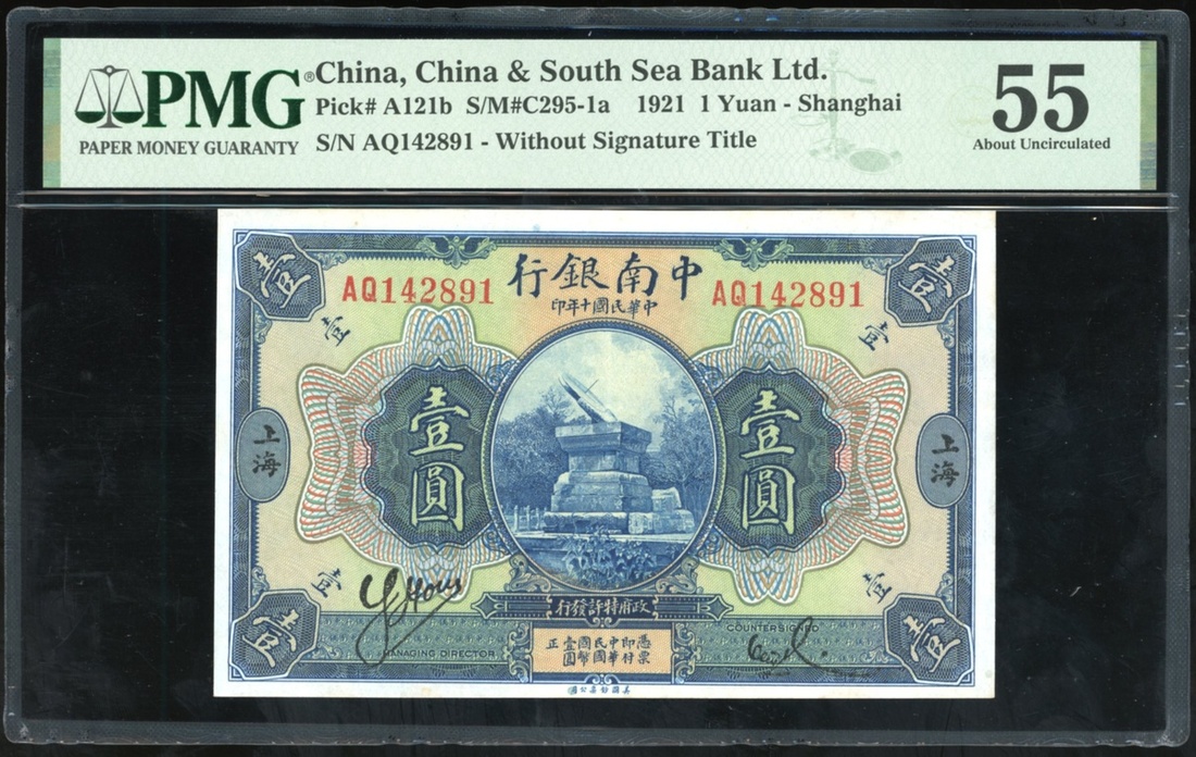 China & South Sea Bank Ltd., 1 yuan, Shanghai, Year 10 (1921), serial number AQ142891, (Pick A121b), PMG 55 About Uncirculated. Quite scarce with only 4 in higher grades on PMG Census.